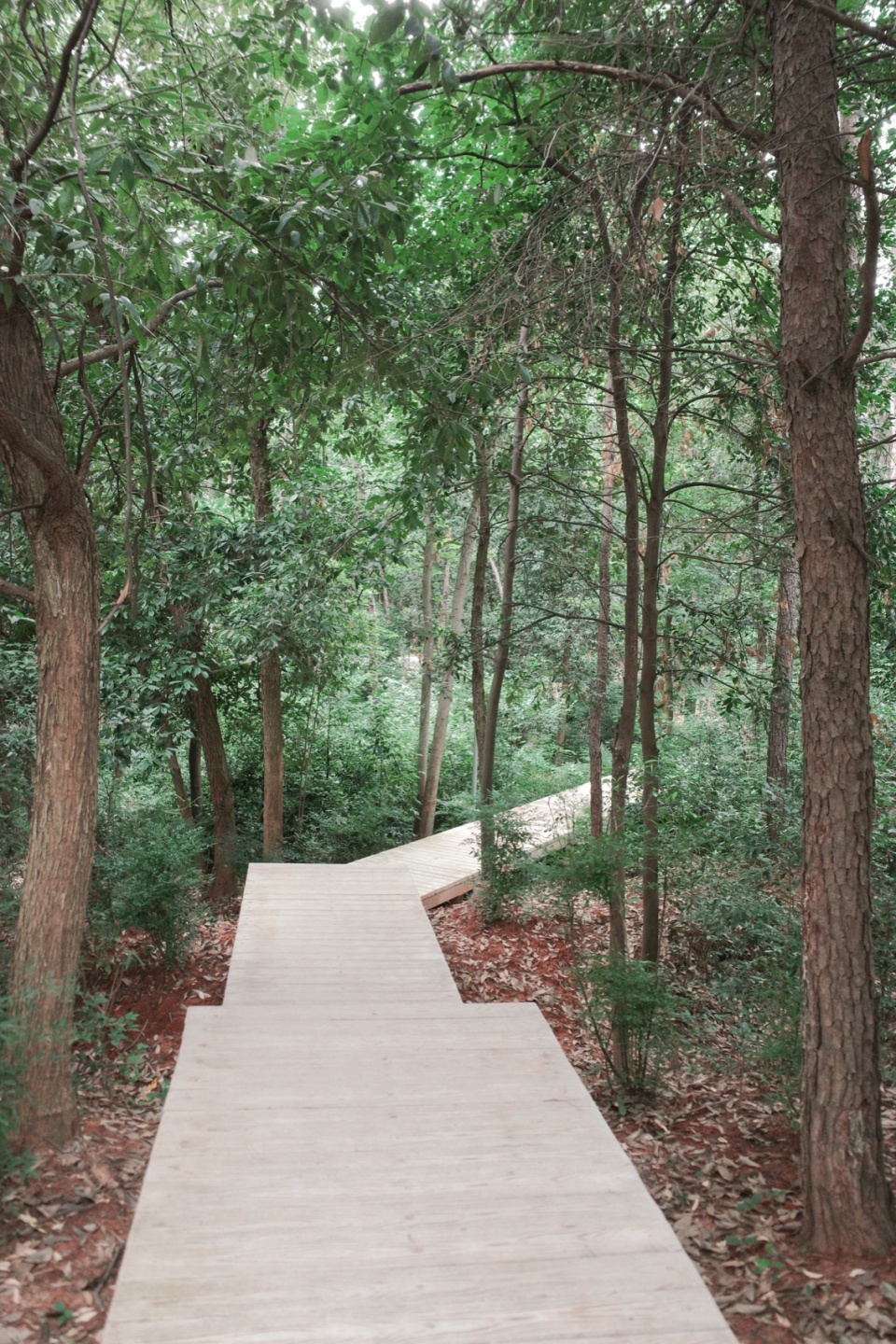 松林内部,散落的斑块状碎石铺地与生态素土铺地并不指向明确的路径,而是意在强化漫游感与探索感。线性矮墙勾勒出山丘地势的起伏,浅色线条在林中若隐若现,也为场地提供了方向感。由于天然马尾松林较为脆弱,易受松材线虫病感染,项目引入了原生马尾松混交林的小苗,调整并建立合理的树种结构,通过增强林下生物多样性,提升松林的抗虫与抗灾能力。
