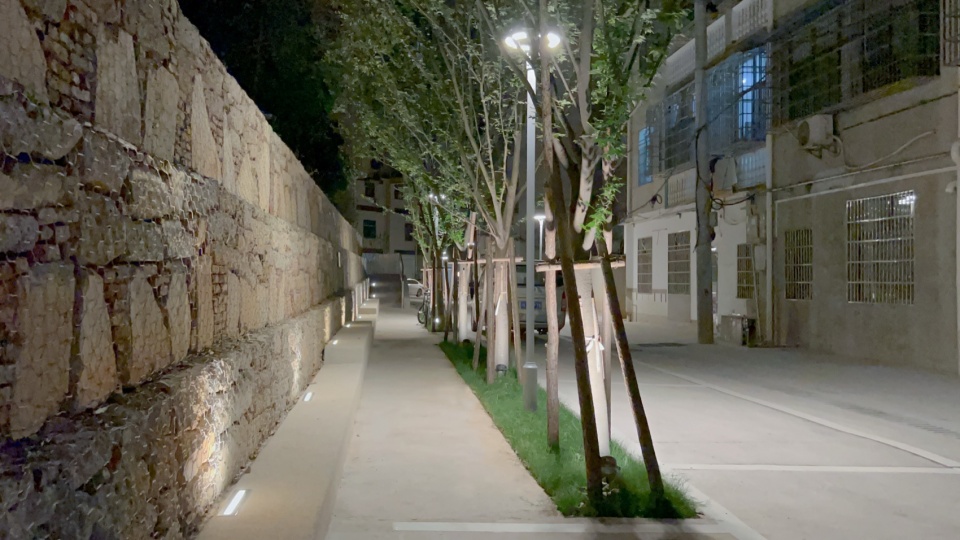 To address the site’s complex elevation changes, the design utilizes the open space between the hill and the buildings, arranging a series of gradually ascending small plazas and sports courts on the southwest side to absorb a height difference of about three meters. Recycled concrete blocks and bricks are wrapped in wire mesh to create gabion retaining walls. At the two main entrances, staggered rest platforms are built along the hillside, using the terrain to create interwoven sightlines and circulation. The overall design aims to offer maximum inclusiveness for the surrounding communities and school, meeting the needs of people of different ages and backgrounds, and creating a welcoming, nature-friendly gathering place amid the bustling city.