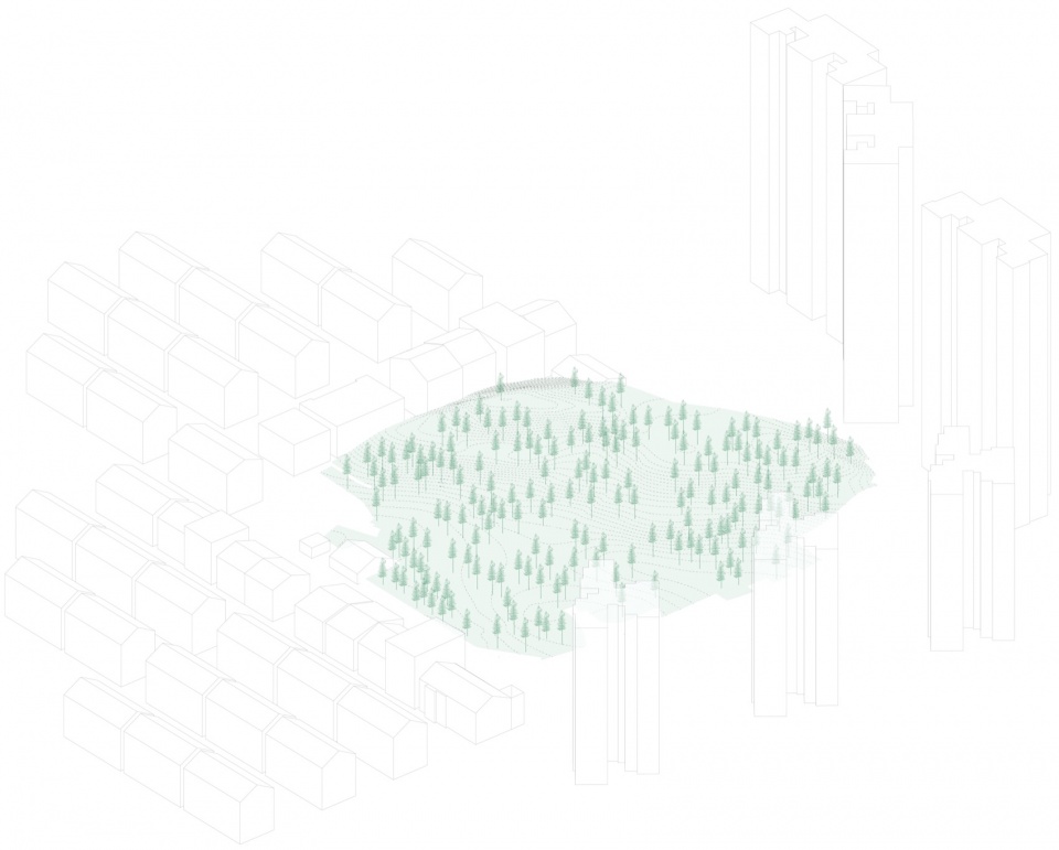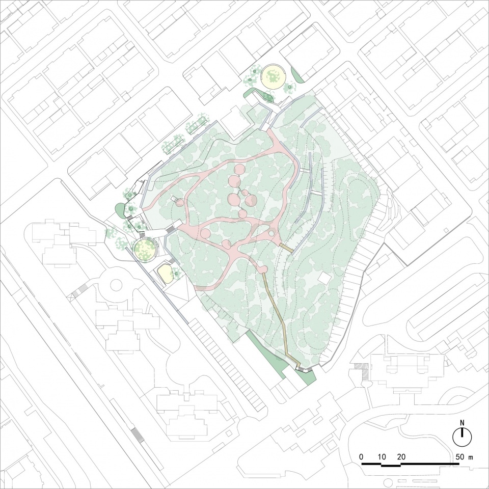 The project is located in the urban area of Xianning City, Hubei Province, China. The site features a small hill covered with a naturally regenerated forest of Masson pines, spanning approximately 16,790 square meters. To the north it borders Fushan New Village, to the south a comprehensive campus with elementary and junior high schools, and to the west high-rise residential complexes and commercial streets. The local villagers hold deep affection for this pine forest and explicitly required that no pine trees be felled during the design and construction of the park. Meanwhile, villagers, residents of the high-rise buildings, and school students will all enter or pass through this small park from different directions, so the new public space must fully accommodate the needs of diverse users.