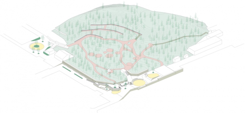 By thoughtfully arranging accessible ramps, the park provides safe and diverse play opportunities for citizens of all ages and makes it easy for wheelchair users to enter and explore most areas. To protect the beloved existing pine forest, the design did not conduct precise surveys of each tree or predefine forest paths on drawings. Instead, it adopted an on-site alignment approach. Construction workers and local laborers, holding white talcum powder, marked routes on the ground within the pine forest and then adjusted sections that were too steep. The resulting path pattern has a Matisse-like, naive charm.