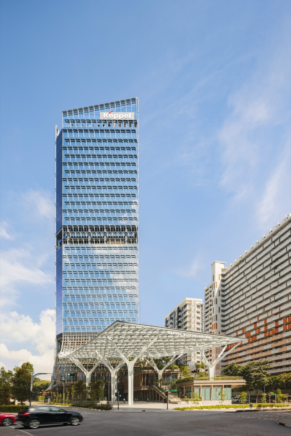 Keppel South Central’s double curtainwall filters sunlight and recycles HVAC air, reducing heat gain by 40% below code. Rooftop photovoltaics power lighting and exterior air fans, while rainwater collected from the building’s environmental veil is reused for landscape irrigation. The tower’s performance-driven design earned Singapore’s highest sustainability rating—Green Mark Platinum (Super Low Energy).