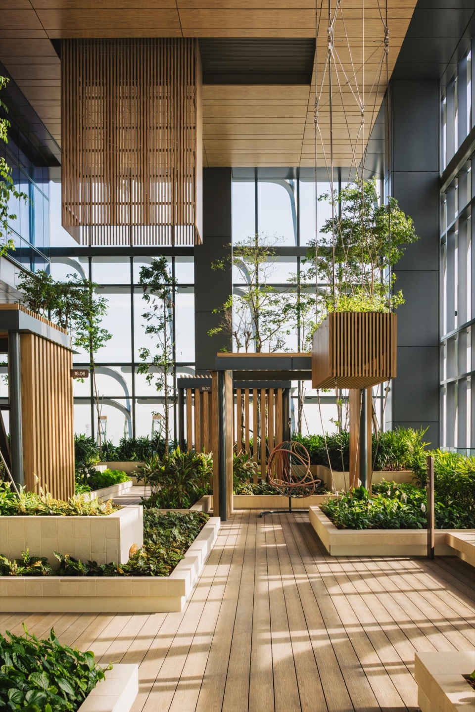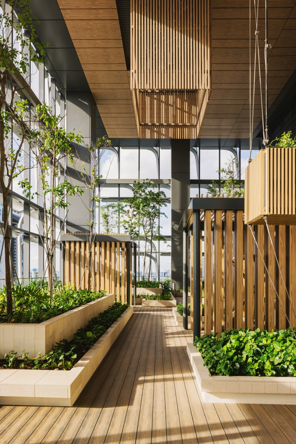 The building’s cascading landscaped roof terraces create an inviting, inclusive effect, capturing the attention of pedestrians along the busy streets of Tanjong Pagar Road.