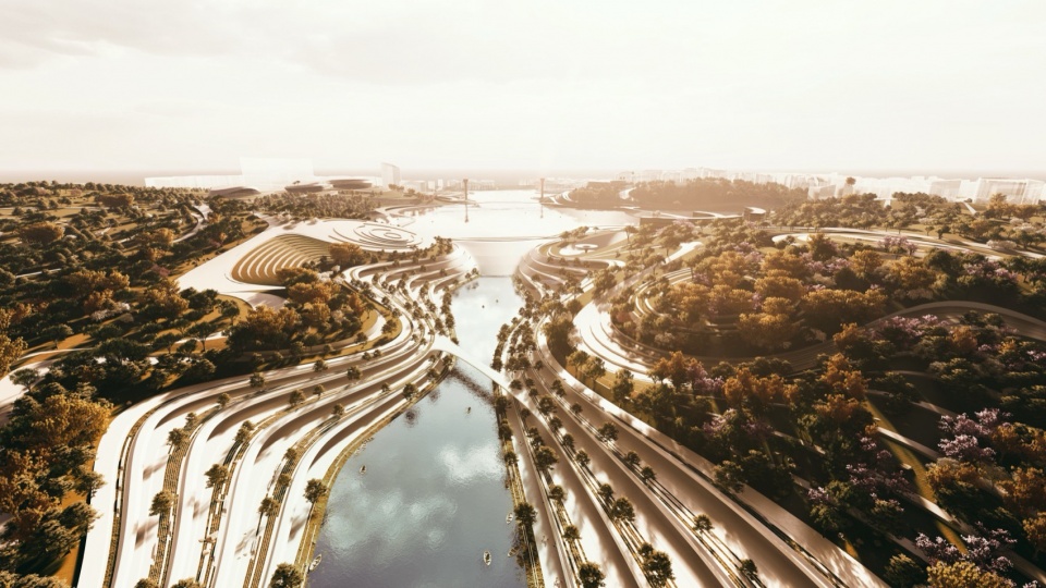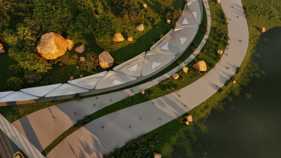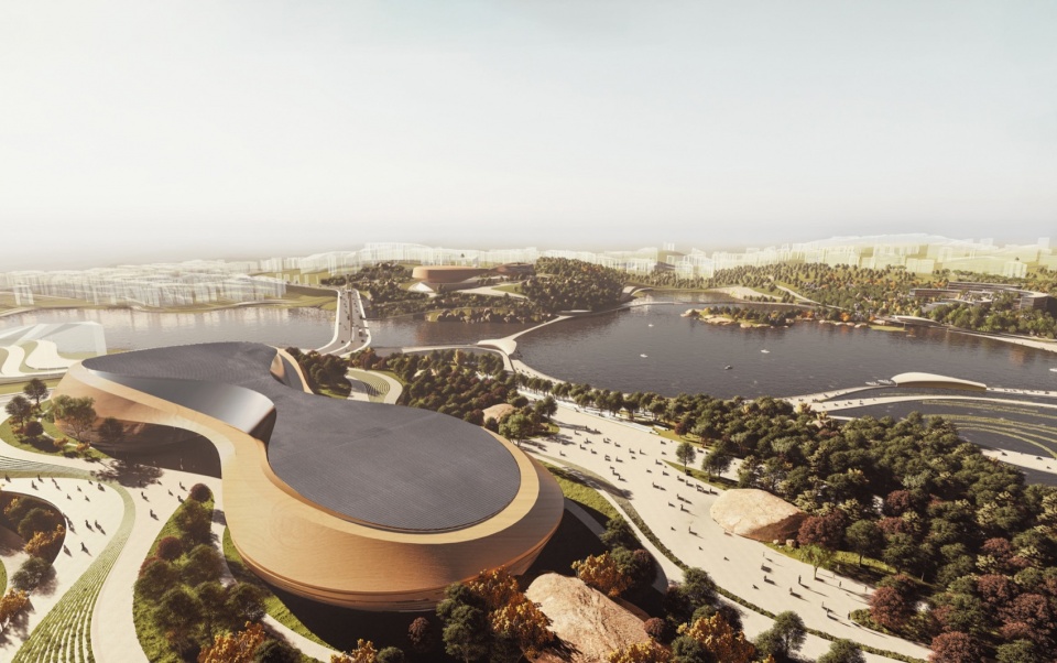 项目引入一系列文化设施,共同塑造城市新的天际线。以跨越湖面的标志性桥梁为核心构筑要素,一端连接科学博物馆,另一端则布局多功能剧院、工艺与艺术博物馆以及会议中心。这些建筑被策略性地布置,以建立鲜明的视觉与文化识别,同时框定标志性桥梁,形成具有象征性的城市景观。此外,剧院与会议中心直接与城市一侧相连,确保便捷的可达性。