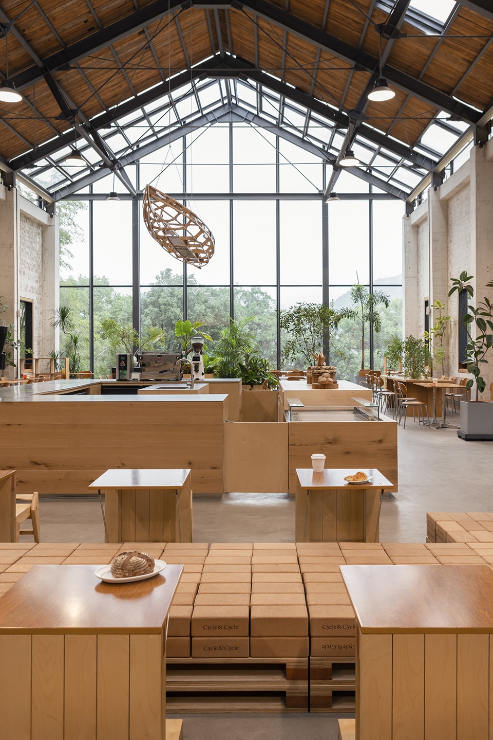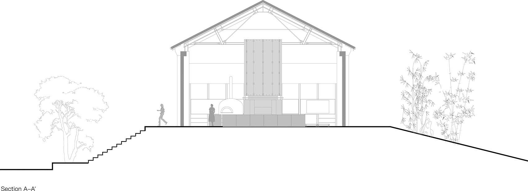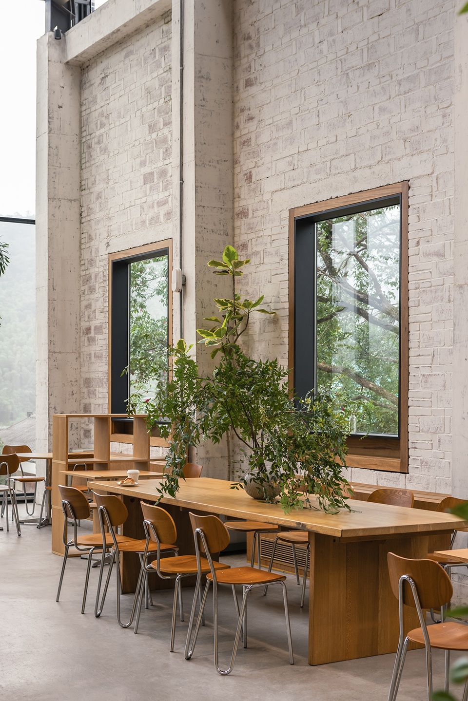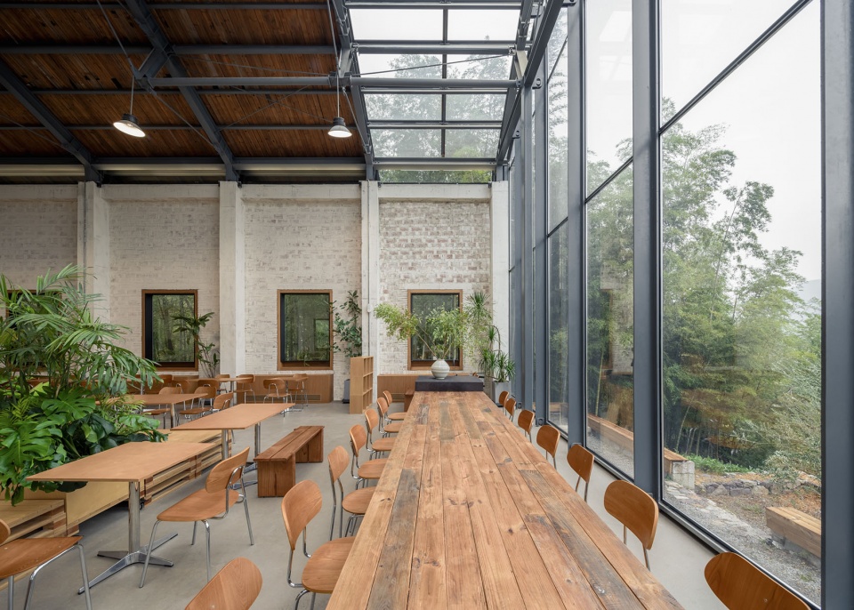 The interior layout likewise responds to the orientation of the site. The west side faces a bamboo grove, where the view is obstructed and the space feels more enclosed; this area is therefore designated for auxiliary functions such as the kitchen and restrooms, forming a relatively self-contained internal structure through an “architecture within architecture” approach. The east side features floor-to-ceiling glass curtain walls that open onto expansive natural scenery, offering abundant natural light and unobstructed views—making it the ideal location for the main dining area, where indoor activities can establish a close connection with the external environment. The overall space remains open and continuous, with the stone oven and the expansive glass curtain walls serving as the core “landscapes” on either side.