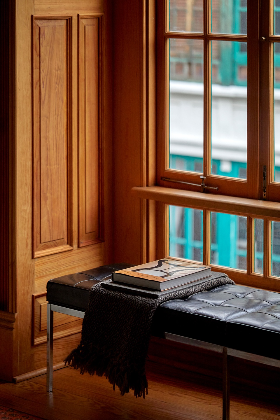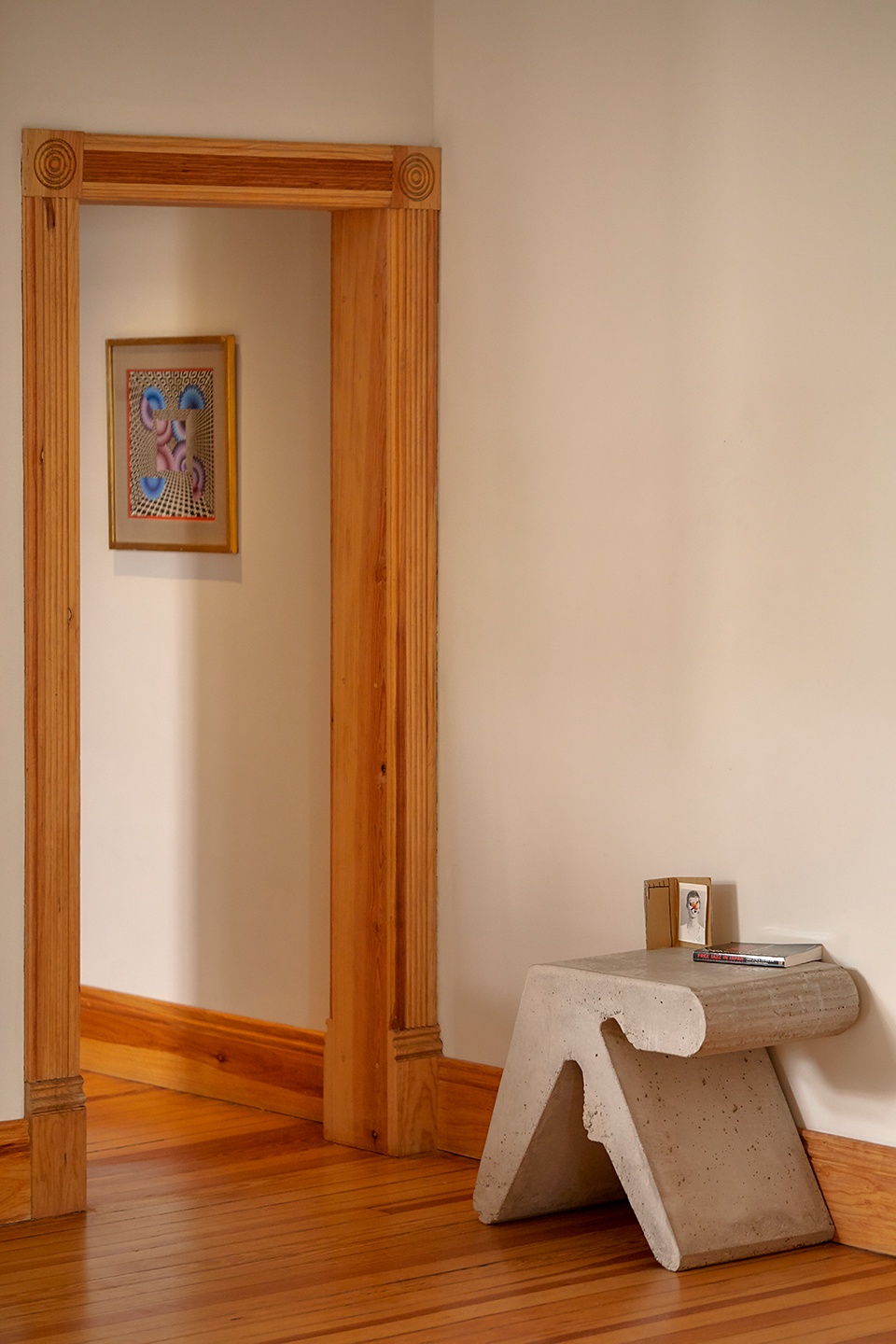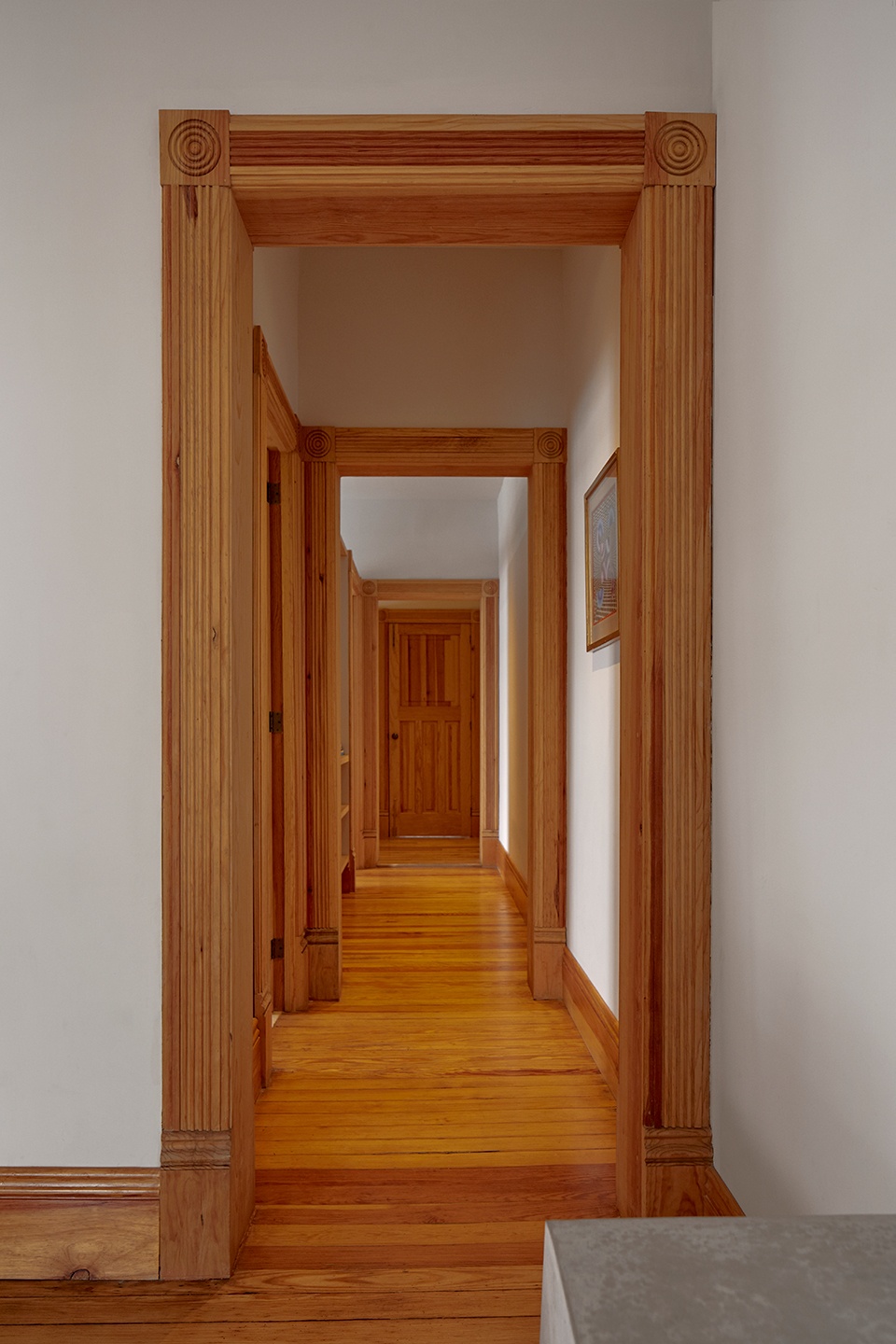 与其将一切拆掉重建,我选择保留建筑原有的“骨架”。原有的墙体、门和层高本身就赋予空间秩序。在此逻辑下,我们对功能进行了调整:两间卧室、厨房和起居空间被重新规划,以满足现代家庭的需求,同时不触碰建筑原貌。从一开始,我们的目标是让建筑重现Arts & Crafts的精神,但又不把它变成博物馆式的空间。因此,我们仔细重制了所有线脚和细节,修复了原有门窗框架和外墙,使其恢复至原来的样貌。这样,公寓依然可以讲述自己的历史故事。