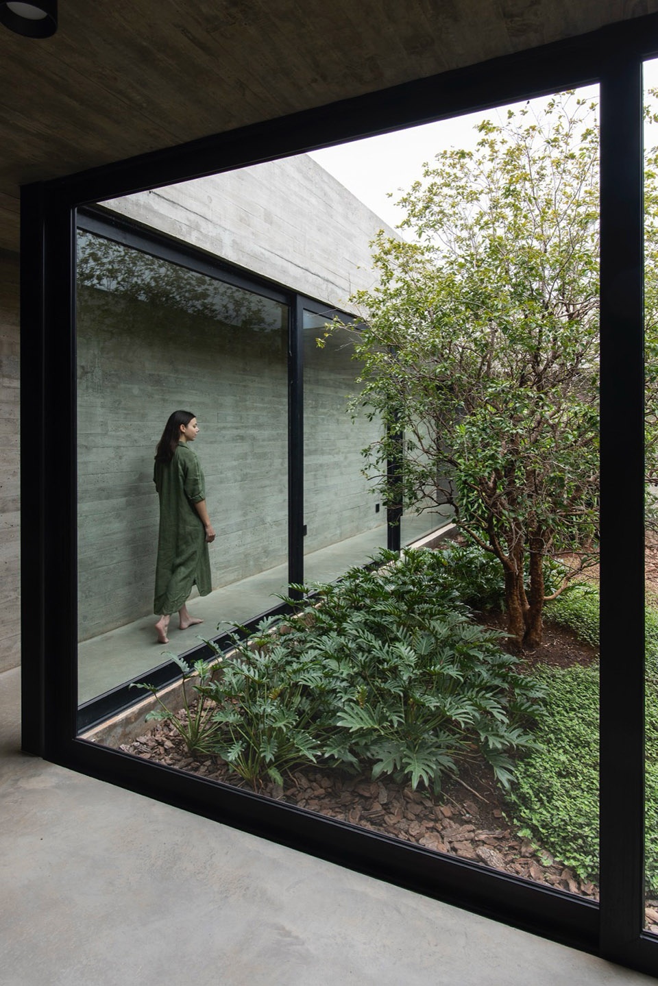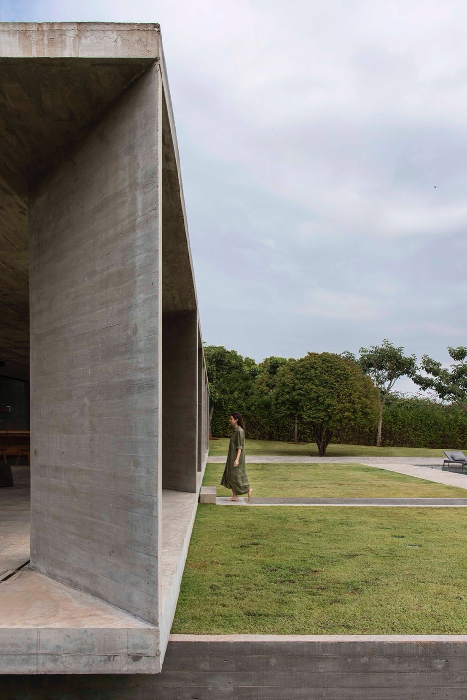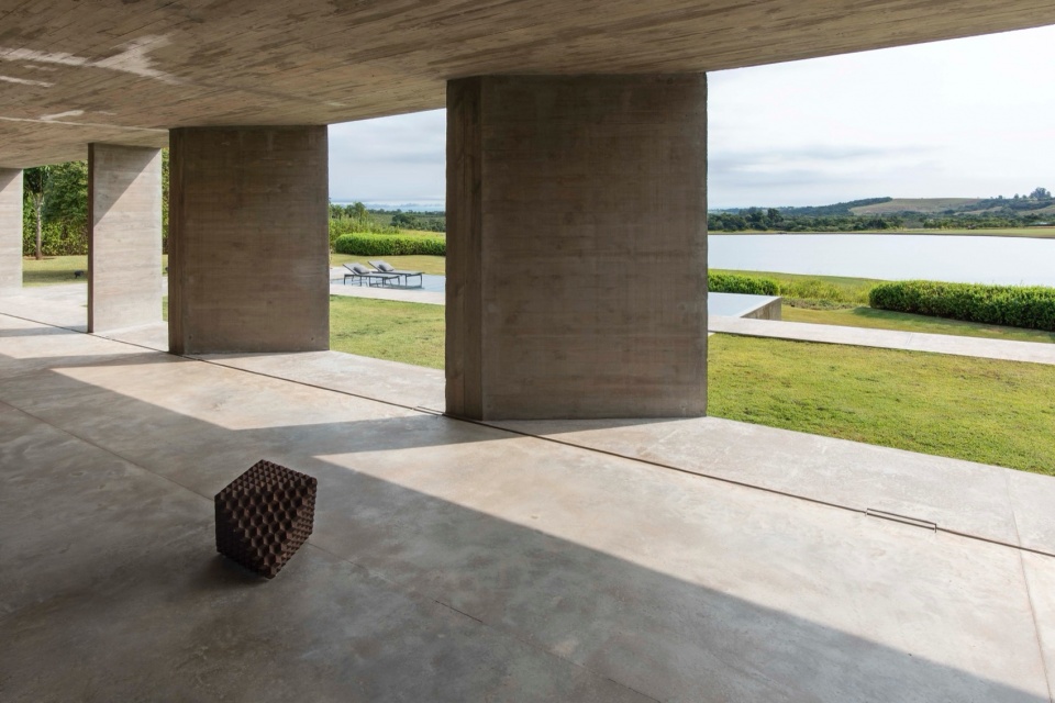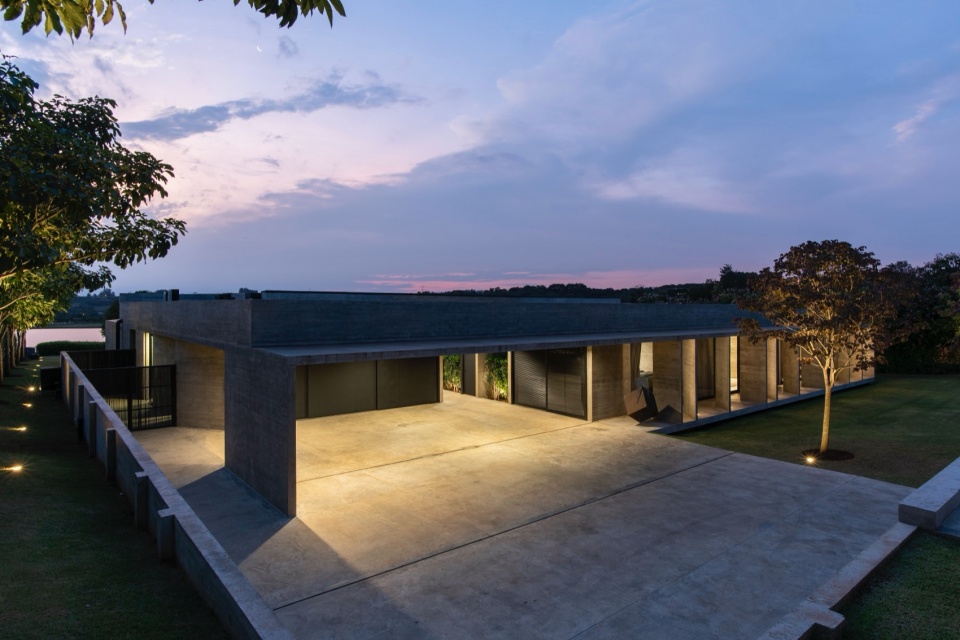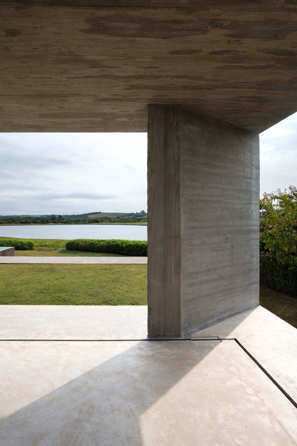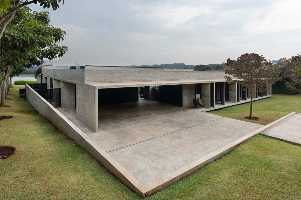 一条宽敞的廊道占据了场地中最具优势的位置,可直接眺望湖泊与高尔夫球场,是住宅的核心空间。在巴西气候条件下,人们一年中大部分时间都可以享受户外生活,可以说,这类空间正是当地生活方式的重要组成部分。由于最佳景观方向同时也是夕阳方向,廊道通过倾斜的混凝土隔墙进行遮阳,以减弱午后阳光的影响。