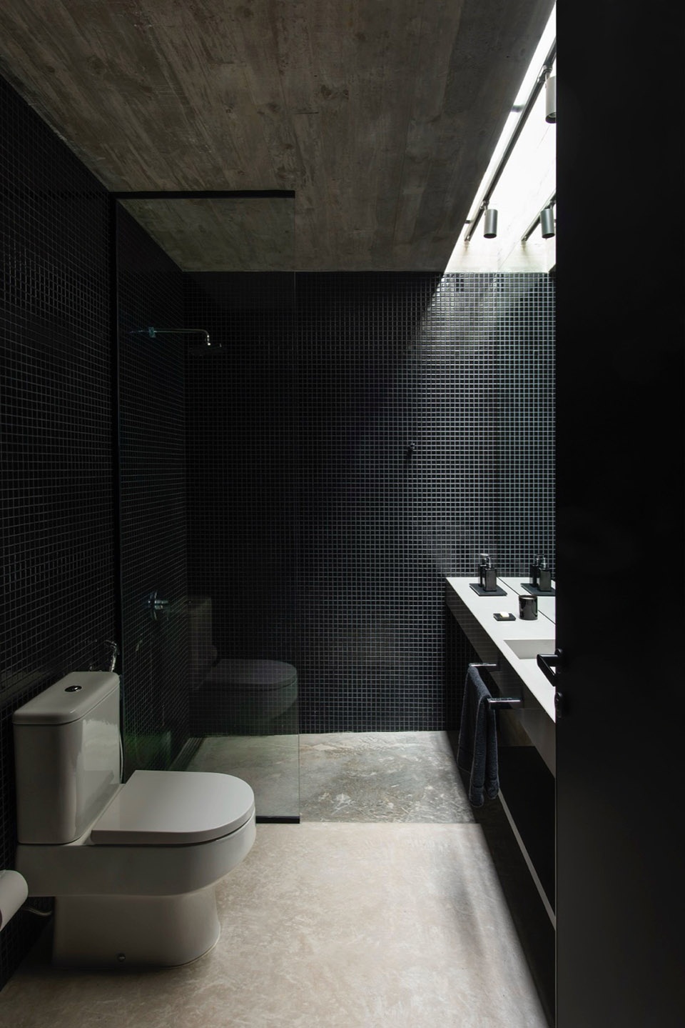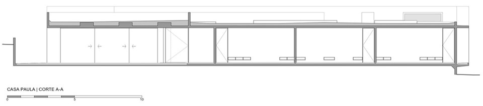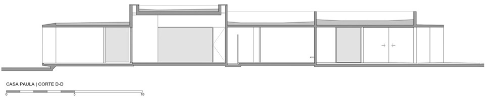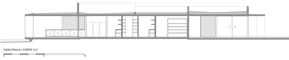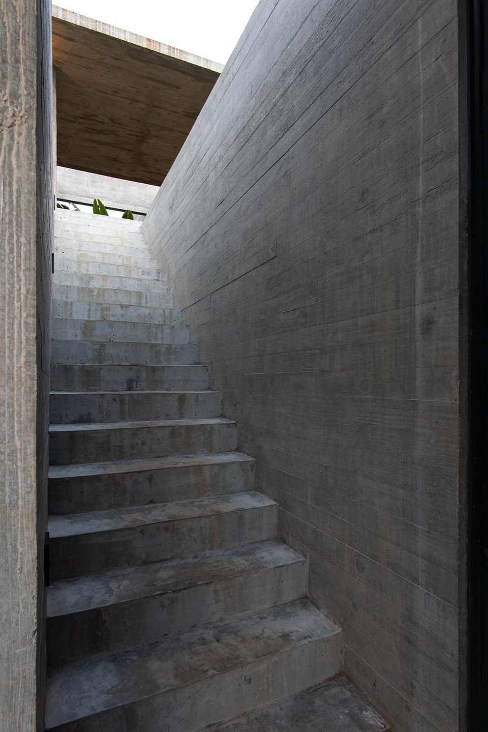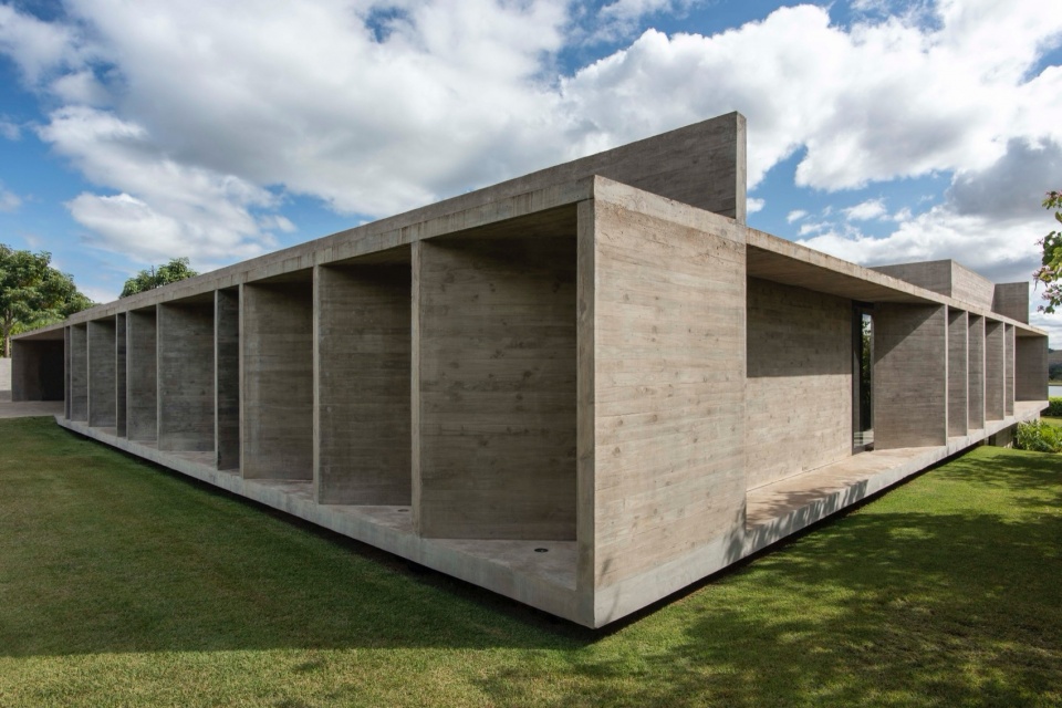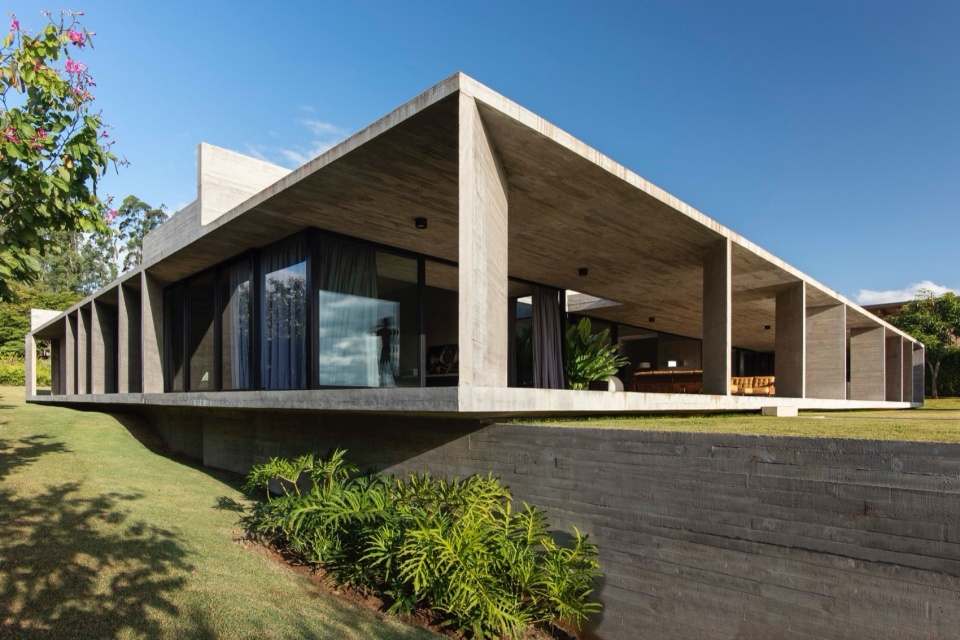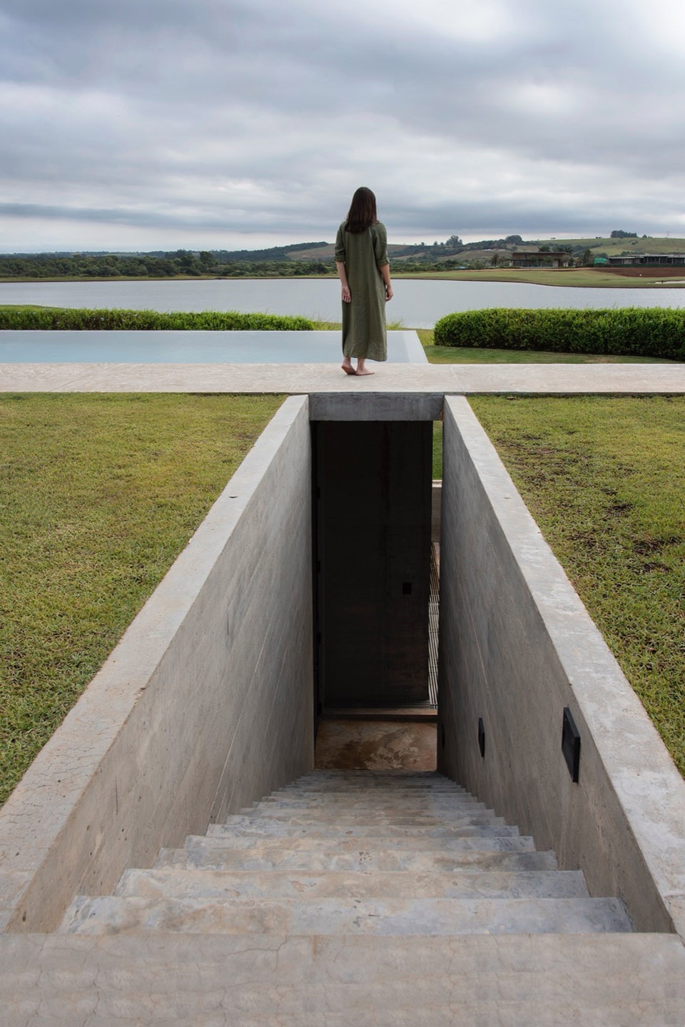 一条宽敞的廊道占据了场地中最具优势的位置,可直接眺望湖泊与高尔夫球场,是住宅的核心空间。在巴西气候条件下,人们一年中大部分时间都可以享受户外生活,可以说,这类空间正是当地生活方式的重要组成部分。由于最佳景观方向同时也是夕阳方向,廊道通过倾斜的混凝土隔墙进行遮阳,以减弱午后阳光的影响。