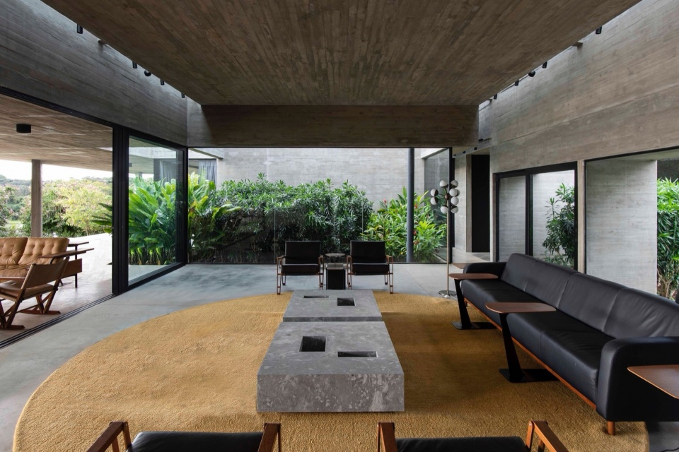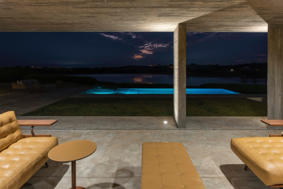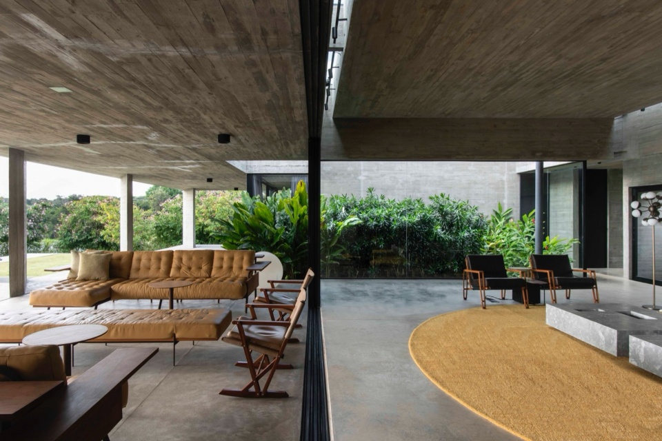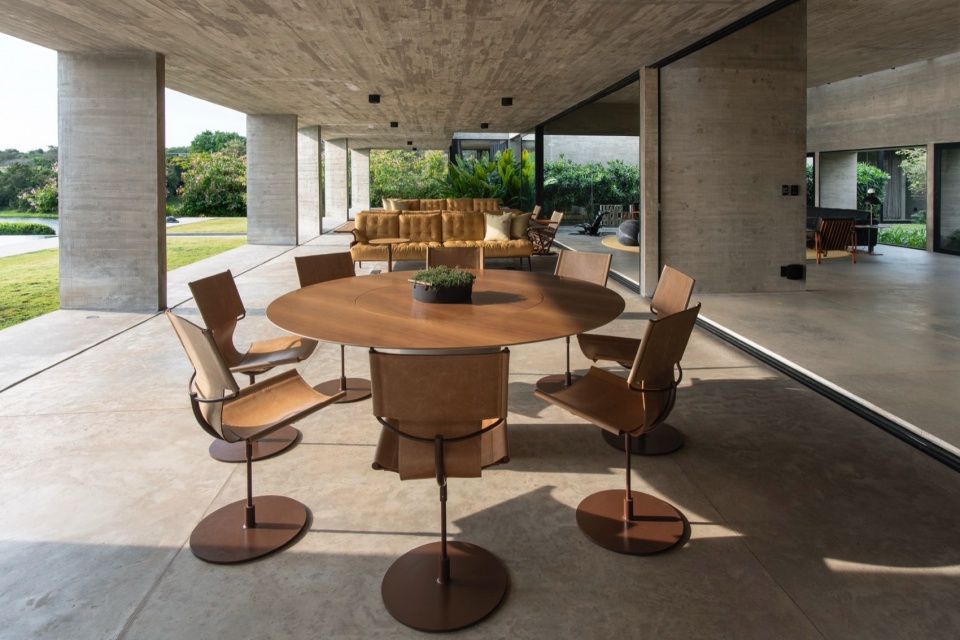 A generous gallery occupies the most privileged position on the lot, offering direct views of the lagoon and golf course. This gallery is the heart of the home. In Brazil, thanks to the climate, it is possible to enjoy the outdoors for much of the year, and it could be said that it is a local custom for life to unfold largely in these types of spaces. Since the best views coincide with the sun’s setting position, the gallery is protected with concrete partitions that, due to their inclination, reduce the impact of the sun in the afternoon.