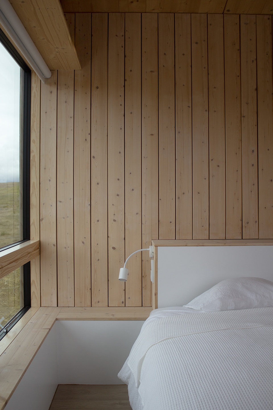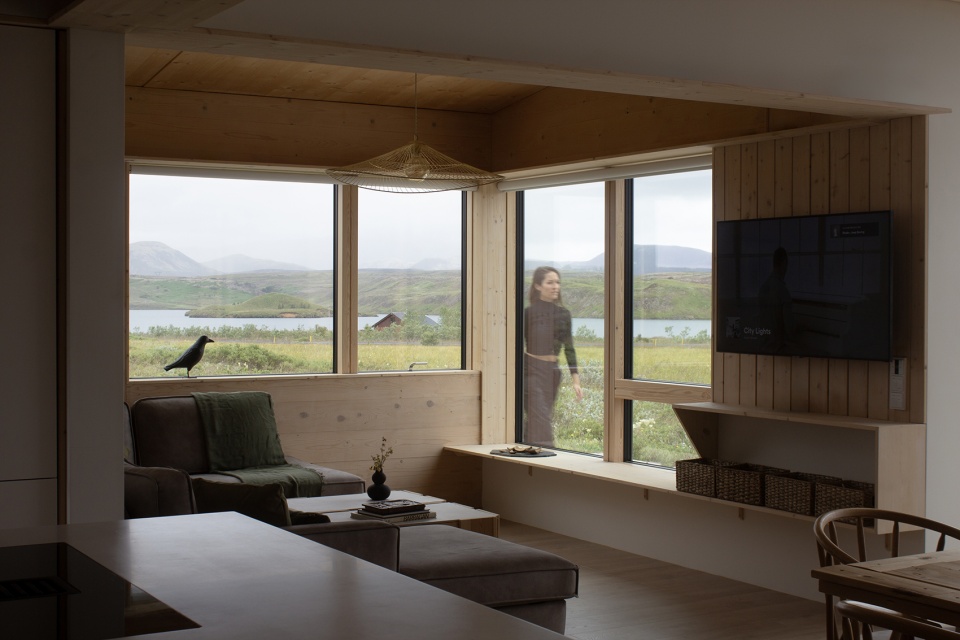 该项目需考虑的主要因素之一便是自然语境。项目坐落于冰岛最重要的水体之一——乌尔夫约茨瓦特恩湖的岸边。Ylja 四周环绕着令人屏息的景色,可饱览湖光、随季节流转而变幻莫测的原野与山峦。这里有白雪皑皑的群山和不可错过的北极光所笼罩的黑暗凛冬,也有适合无尽沉思的壮丽极昼夏日。因此,住宅的形态经过精心设计并巧妙选址,使其拥有180度的开阔视野,并与这片绝美的景观融为一体,显得尽可能地自然。