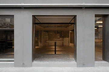 Authenticity is inherent to the space, which is the coexistence of unity and diversity. It is reflected in the use of materials. Metals are used a lot in the space, including the stainless steel plates, the hot-dip galvanized finishes, as well as the metal mesh. The preservation of distinct textures on different metal surfaces embodies diversity and unity. Except for the door area, the partition between the exhibition space and the bar area is made of dark double-layer metal mesh, which allows different atmospheres to communicate while dividing different areas. The moiré effect generated by the double-layer metal mesh complements the dreamy atmosphere within the factory building space perfectly. The doors are assembled of hot-dip galvanized plates of varying sizes with straight-head screws, and stainless steel plates are applied to the handle areas which are prone to wear. The metal plates, mirrors, gray floors and dark gray metal mesh share a harmonious color palette yet hold distinct material textures, and together visualize an ideal future city.