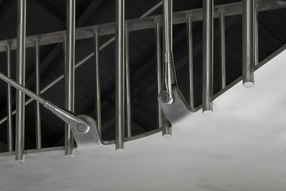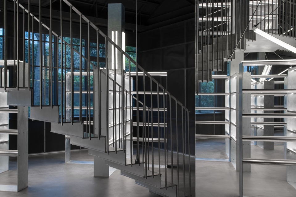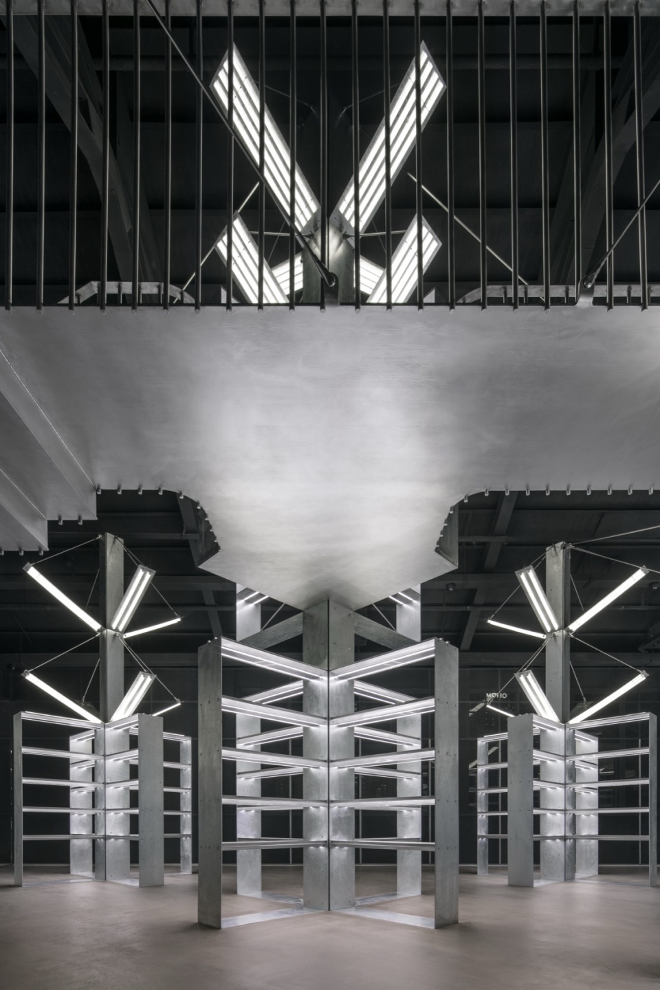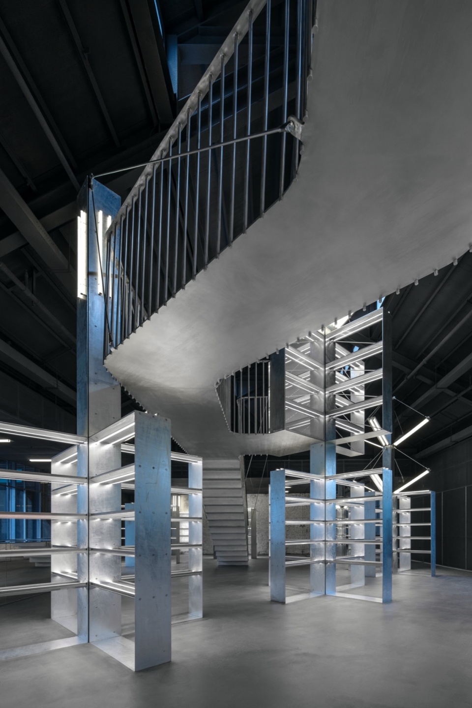 There are 11 cross-shaped display racks and an overpass arranged inside the factory building. The overpass adopts an ultra-thin beamless steel structure system, which is the result of repeated deliberation and calculation by the architects and the structural engineers. The whole overpass are made of one piece of 12mm-thick solid stainless steel plate, which is suspended from the central columns of several cross-shaped display racks via stay cables. The cable connection fittings on the edges of the overpass are an integral part of the overpass steel plates. They are folded with different angles and are connected to the corresponding steel cables respectively. Each cross-shaped display rack takes a metal frame as the basic unit, with four frames forming a cross shape at 90-degree angles to one another. Shelves are built inside the frames for display purposes. Some racks cantilever a second layer of frames above with steel cables as the structure. The bottom of each cross-shaped display rack is flush with the ground and connected to the pre-embedded structural beams underneath. The display racks, the stay cable system and the overpass form a whole stable structure. Parts of the cross-shaped display racks are embedded with the overpass. The stairs, the overpass, the display racks and the steel cable connection fittings are seamlessly integrated, as if cut and folded from a single solid steel plate.