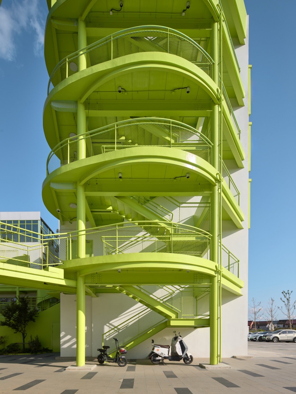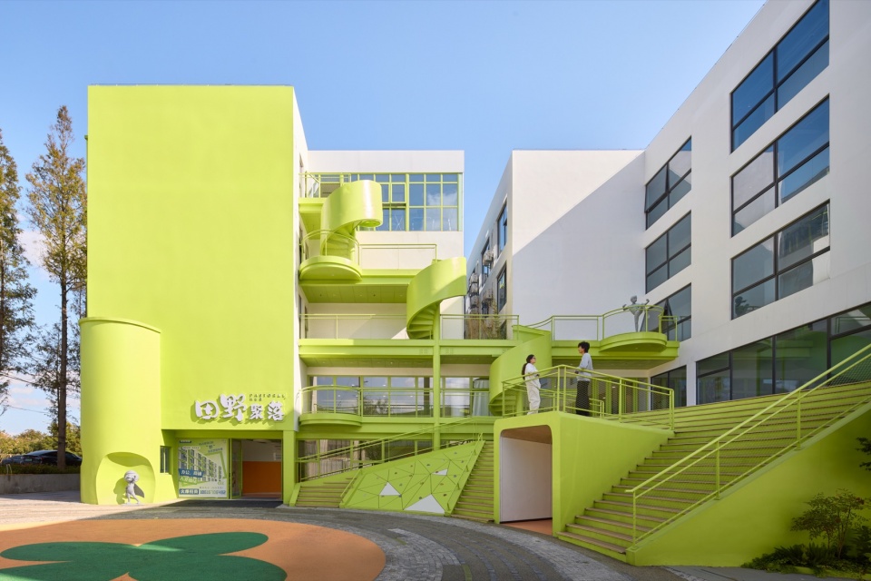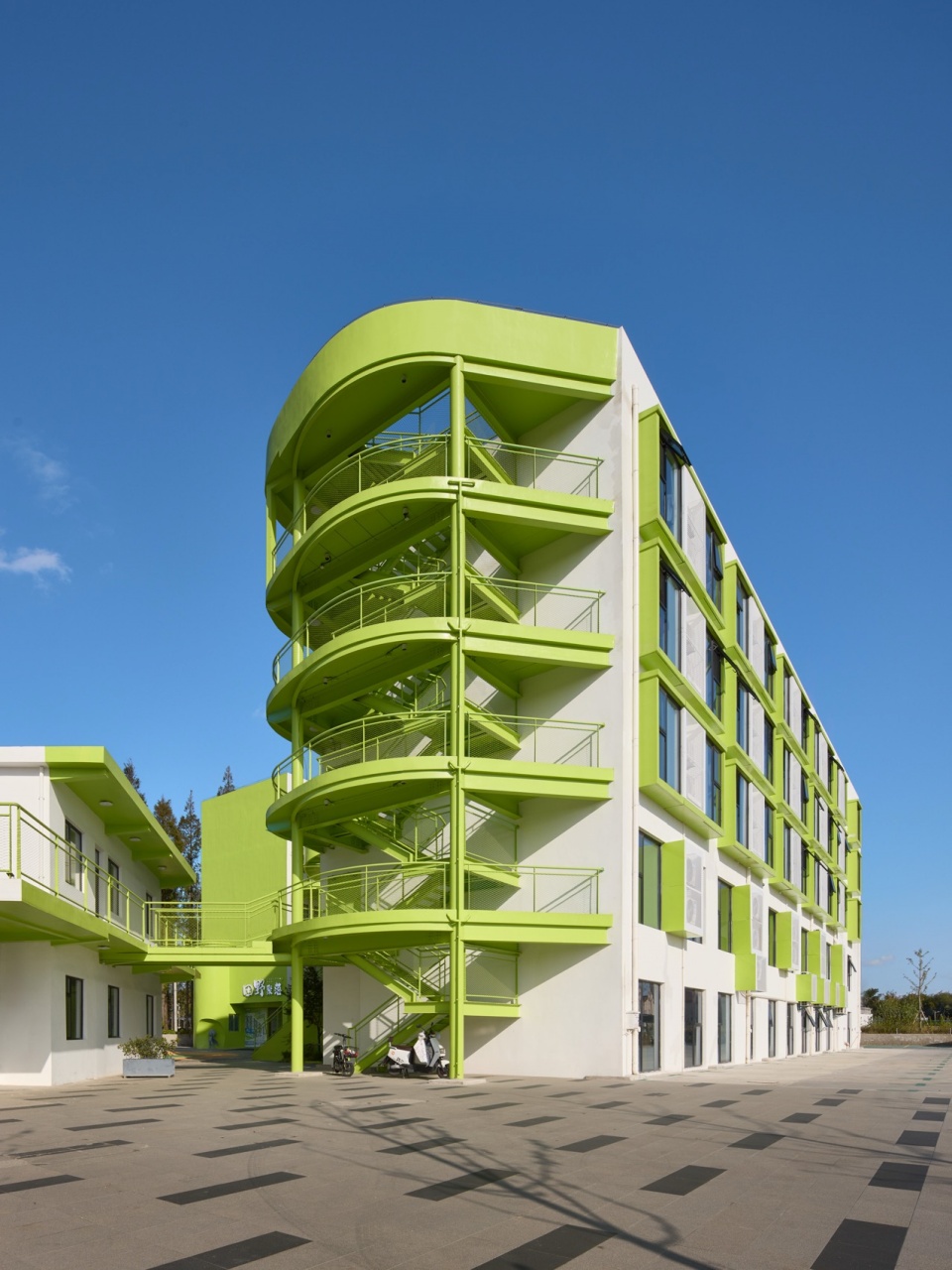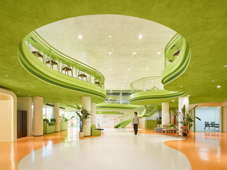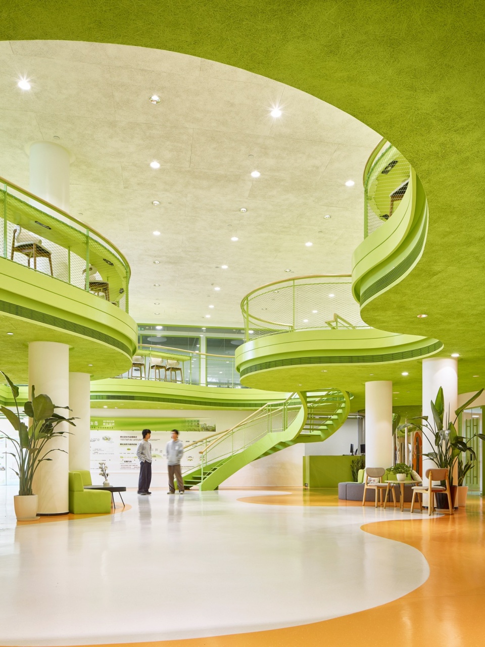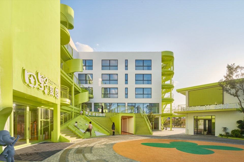 The project adopts a lively and playful light green as its theme color, evoking the image of new shoots breaking through the soil in the fields. This color scheme retains the pure, rustic charm of rural architecture while adding a distinct youthful flair. Leveraging the original outline of the factory building, the site is enclosed to form a public stage, ideal for hosting various events. The outdoor floor is paved with orange and green tiles arranged in a cherry tomato pattern, and combined with the cartoon sculptures at the entrance, it further enhances the youthful and lovely ambiance of the space, turning the entire community into a tangible and interactive “giant toy”. The interior continues the use of fluid curves and vibrant color elements, filling the space with dynamism.