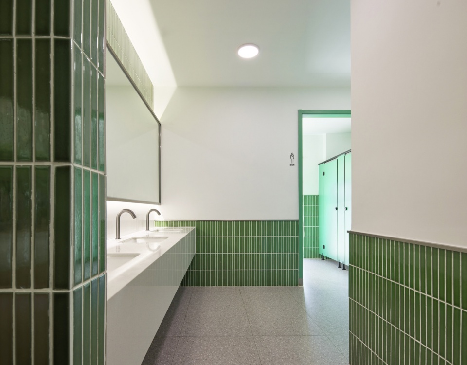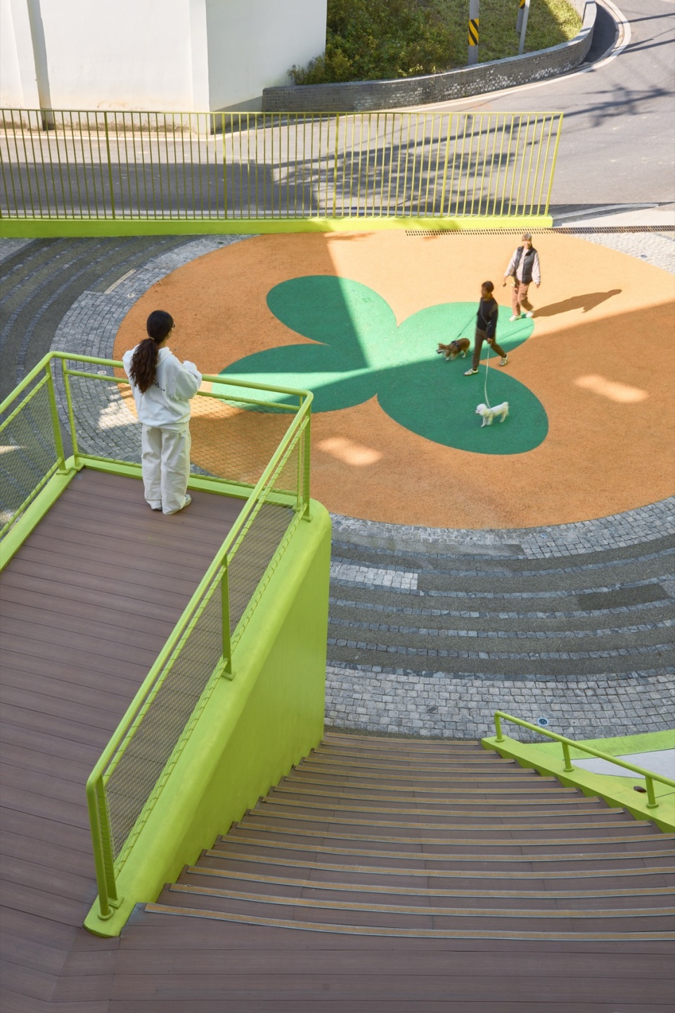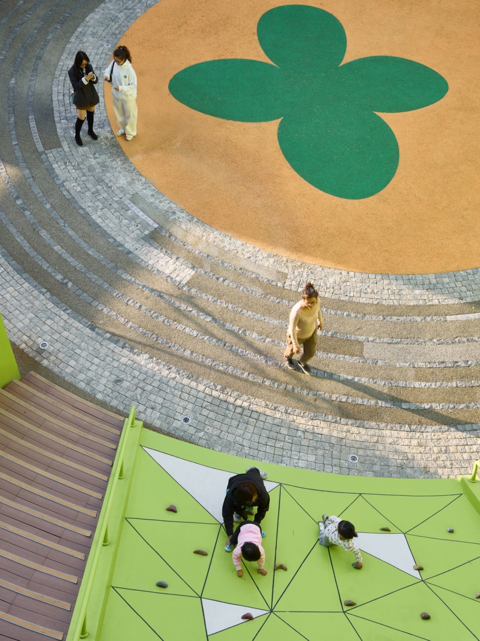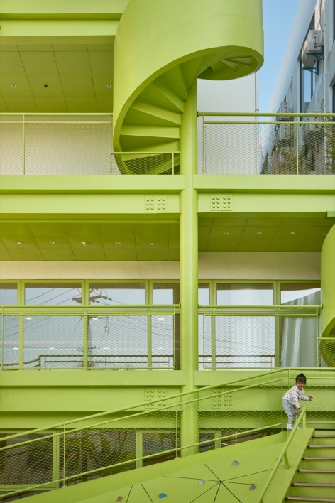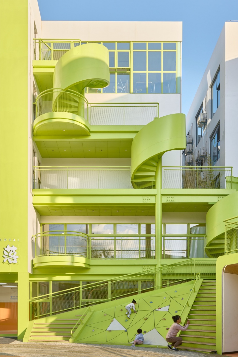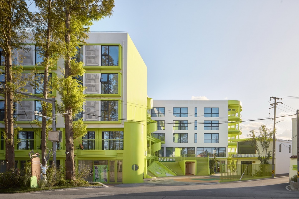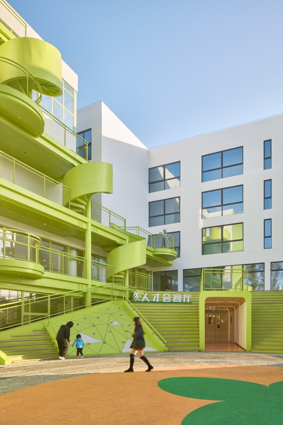 The project adopts a lively and playful light green as its theme color, evoking the image of new shoots breaking through the soil in the fields. This color scheme retains the pure, rustic charm of rural architecture while adding a distinct youthful flair. Leveraging the original outline of the factory building, the site is enclosed to form a public stage, ideal for hosting various events. The outdoor floor is paved with orange and green tiles arranged in a cherry tomato pattern, and combined with the cartoon sculptures at the entrance, it further enhances the youthful and lovely ambiance of the space, turning the entire community into a tangible and interactive “giant toy”. The interior continues the use of fluid curves and vibrant color elements, filling the space with dynamism.