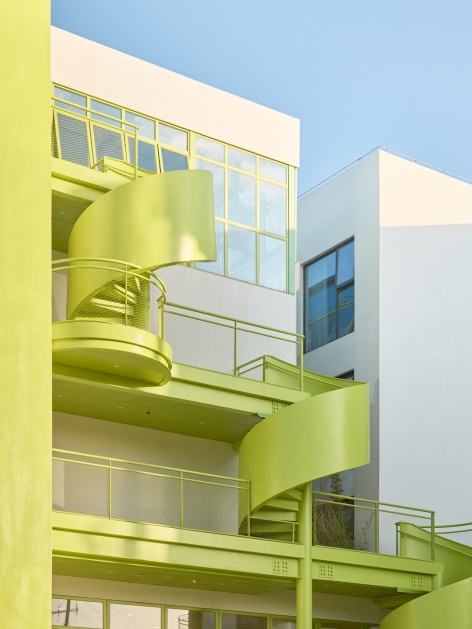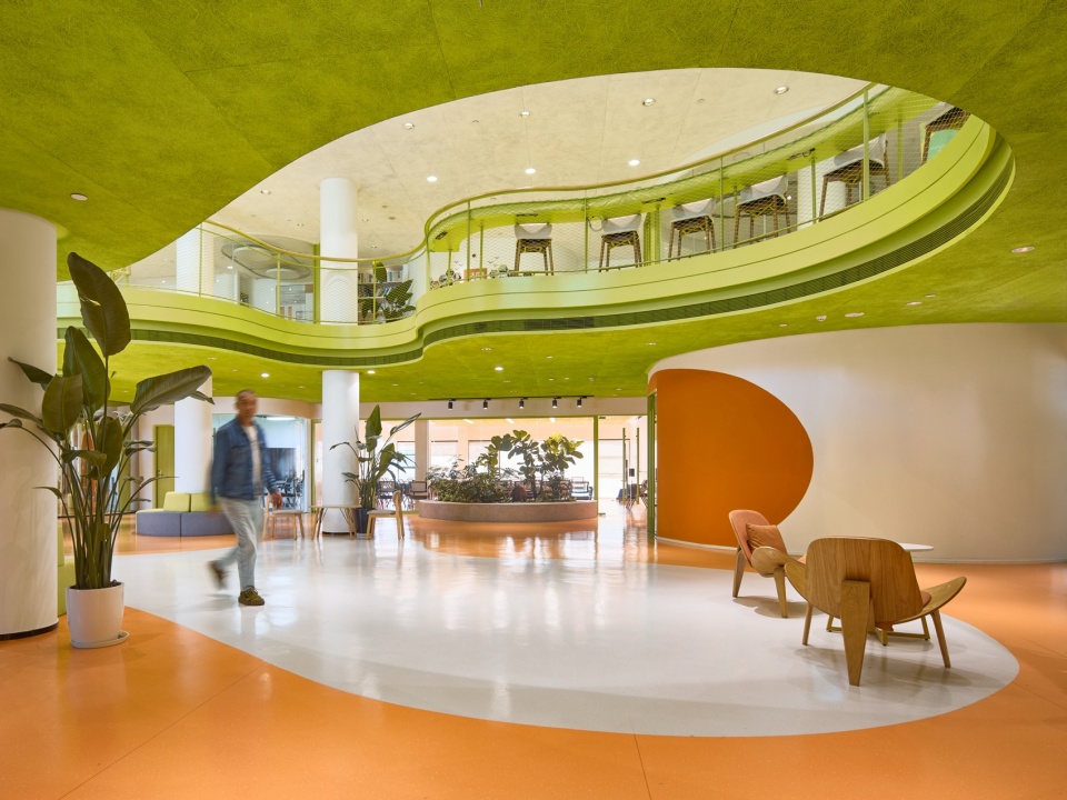项目以活泼俏皮的嫩绿色为主题色,如同田野中破土而出的新芽,既保留了乡村建筑的纯净底色,又注入了鲜明的青春标识。设计利用原有厂房轮廓,场地合围形成公共舞台,便于举办各种活动。室外地面铺装以橙色与绿色拼贴出小番茄图案,结合入口处的卡通雕塑,进一步强化青春可爱的空间气质,让整个社区成为一个可触摸、可互动的 “大玩具”。而室内则延续了流动的曲线和色彩元素,使整个空间活力满满。