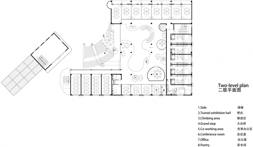 青年社区的一层与二层设置为开放模式,以中庭为中心,环绕布置小型办公室与会议室。作为社区的活力锚点,一层设置开放的创意办公、社区展厅与共享会客厅。大面积的落地玻璃消解了室内外界限,让绿意与田野自然渗透。二层以开放式工位与独立工作室相结合,营造在自然里办公的松弛氛围。内部空间通过曲线消解了空间尺度,中庭可以用来举办活动或布置成灵活办公。饱满明快的色彩,活泼生动的线条,使室内空间充满青春的气息。