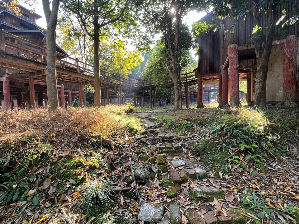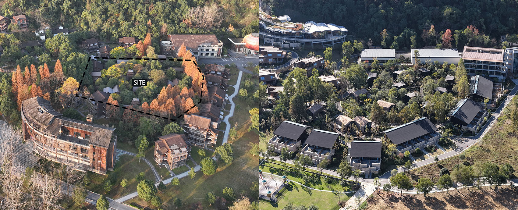 Stepping on fallen twigs and withered leaves, walking beneath the raised walkways, the grass and moss continue their undulating rhythm across the terrain – this is the ultimate call of the site. Since 2022, this landscape in Hangzhou Tonglu’s “Grandma’s Home” resort area has undergone its largest transformation since 1990. Over more than two decades of dramatic change in China, the meaning and outward forms of retreat have evolved enormously. Yet after careful site investigation, SpActrum concluded that while the original site strategy had failed in terms of specific forms and materials, the trees that have grown alongside the buildings over the past twenty years stood out as an effective, naturally grown site strategy.