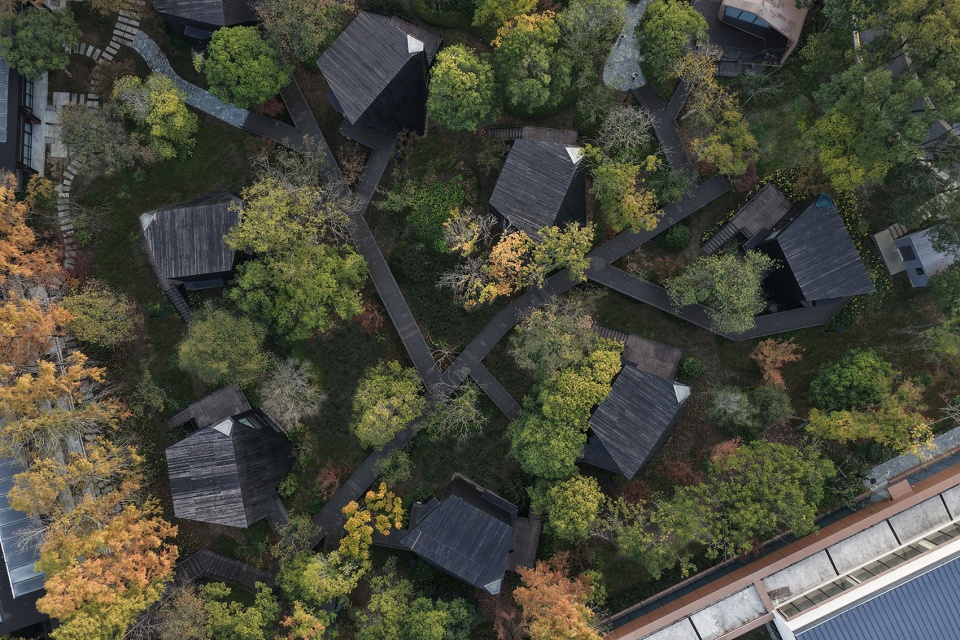 ▼潜行之屋组团顶视航拍,top view aerial of the cabin cluster
