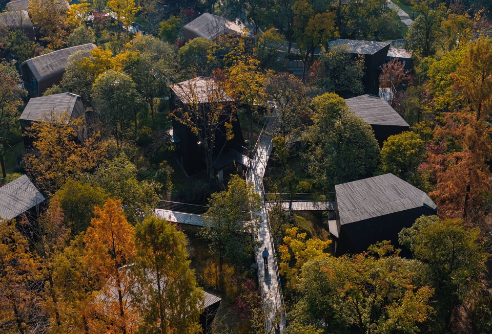The journey orchestrated by the walkways, the interwoven silhouettes of cabins and forest – all of this coalesces into an ecological, perception-awakening dwelling system.