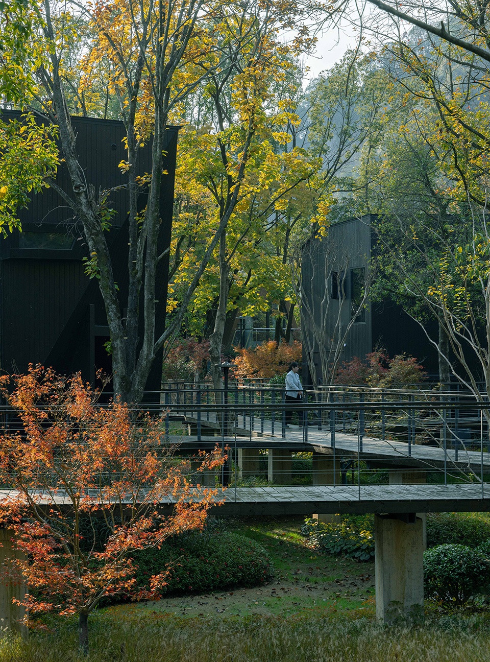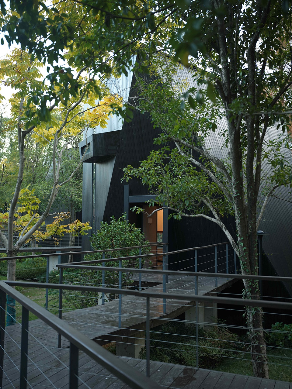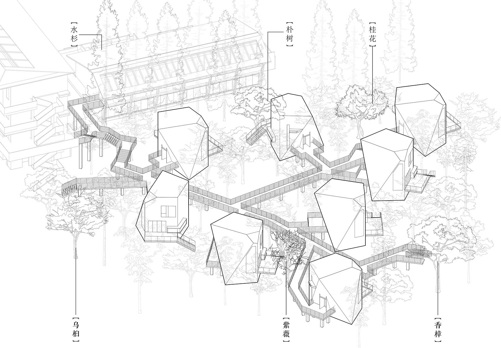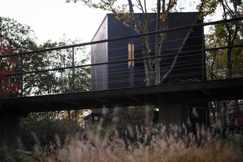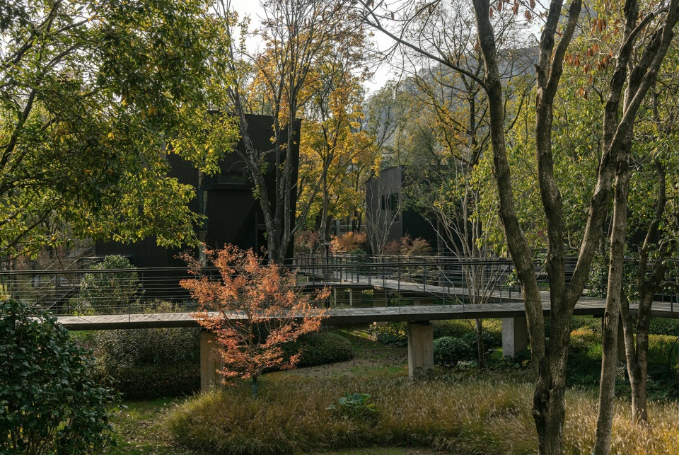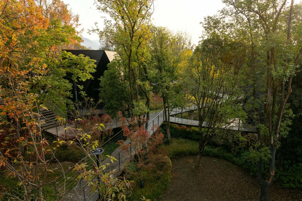 架空的栈道系统在自觉限制人的行为范围内,带领客人,穿行在树林中,寻找被掩映其间的黑色木屋,潜行,回归到动词。