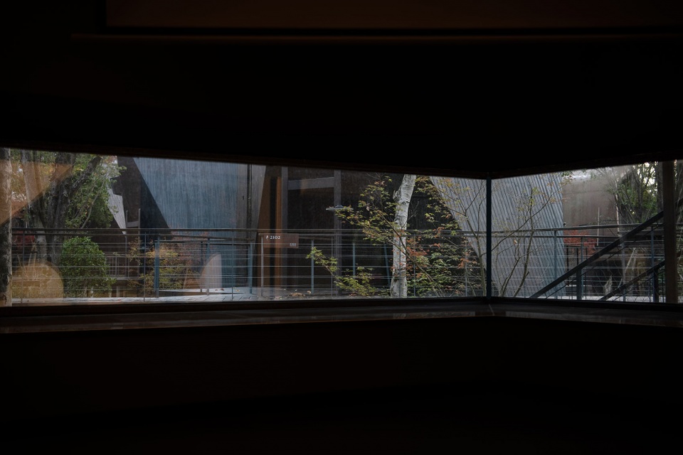 The form achieves a tense balance between motion and stillness. On this faceted geometry, window openings are arranged in series, mainly distributed across vertical planes. The apertures aim to maximise the internal dimensions of the interior. The vertical glazing facing the double-height void appears as narrow slits, while the horizontal glazing facing the sunken seating area extends outward, transforming the forest outside into scrolls and panoramic landscapes. On the second floor, the window facing the bed separates daylight and ventilation – leaving the outward-viewing glazing pure and unobstructed, while integrating the ventilation window into a larger window system. The bathroom window aligns with the line of sight when lying in the bathtub; a protruding horizontal element outside restricts the view, allowing only outward glances from inside while preventing any view in from the outside.