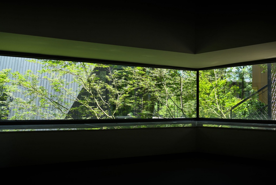 形在运动状态和静止中取得一种具有张力的平衡。在切角后的几何形体上,开窗考虑到串联的设置,主要分布在垂直面上。开孔试图在室内呈现极致向度的最大化,面对挑空部分的垂直玻璃窗成竖条状,面对室内下沉沙发区的玻璃水平延展,将户外的森林转化为条幅与长卷。二层对着床的窗将采光和通风分解开,让对外的景窗纯粹干净,与通风的窗组合成一个大的系统。卫生间的窗对着在浴缸里躺卧的视线位置,户外以突出的水平形状约束视线,只能从室内瞭望外部,从外部则无法窥探室内。