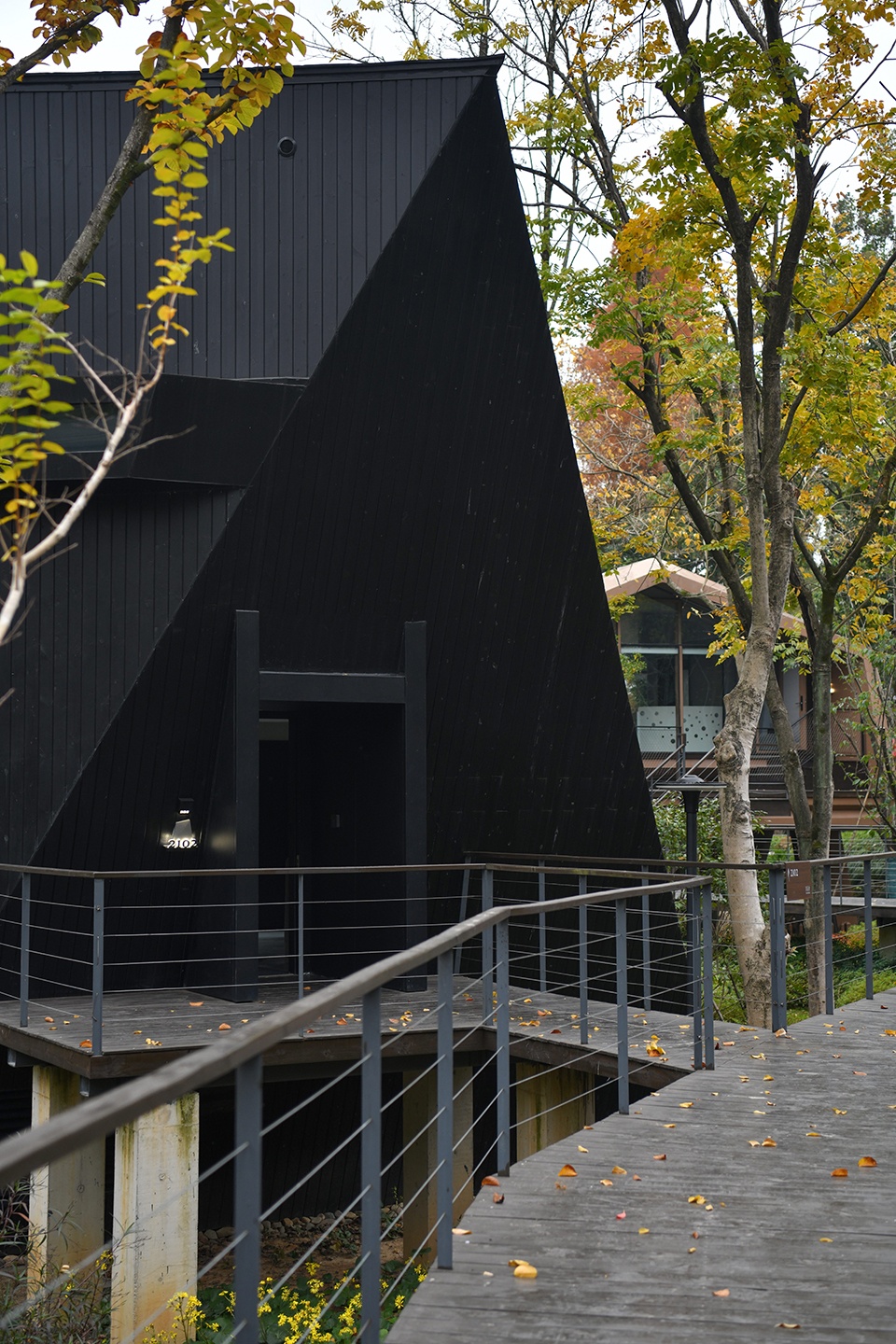 行进在栈道中,建筑仿佛瞬移至此,定格在不同表情的黑色精灵。在行走中,同时面对着隐现的不同侧面的木屋,封闭而倾斜的三角面,三角与四边形拼接的面,两个三角形对接的面,纯粹方正的四边形面,一个小小的体块在栈道引领的视角中仿佛有了无穷多的面向。
