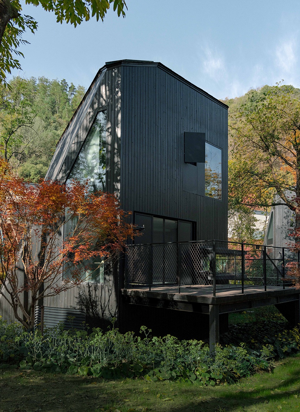 黑色木屋以五边形柱体为基础,切削两个面取得同一物体的非连续性立面间的张力,是为潜行的形式。