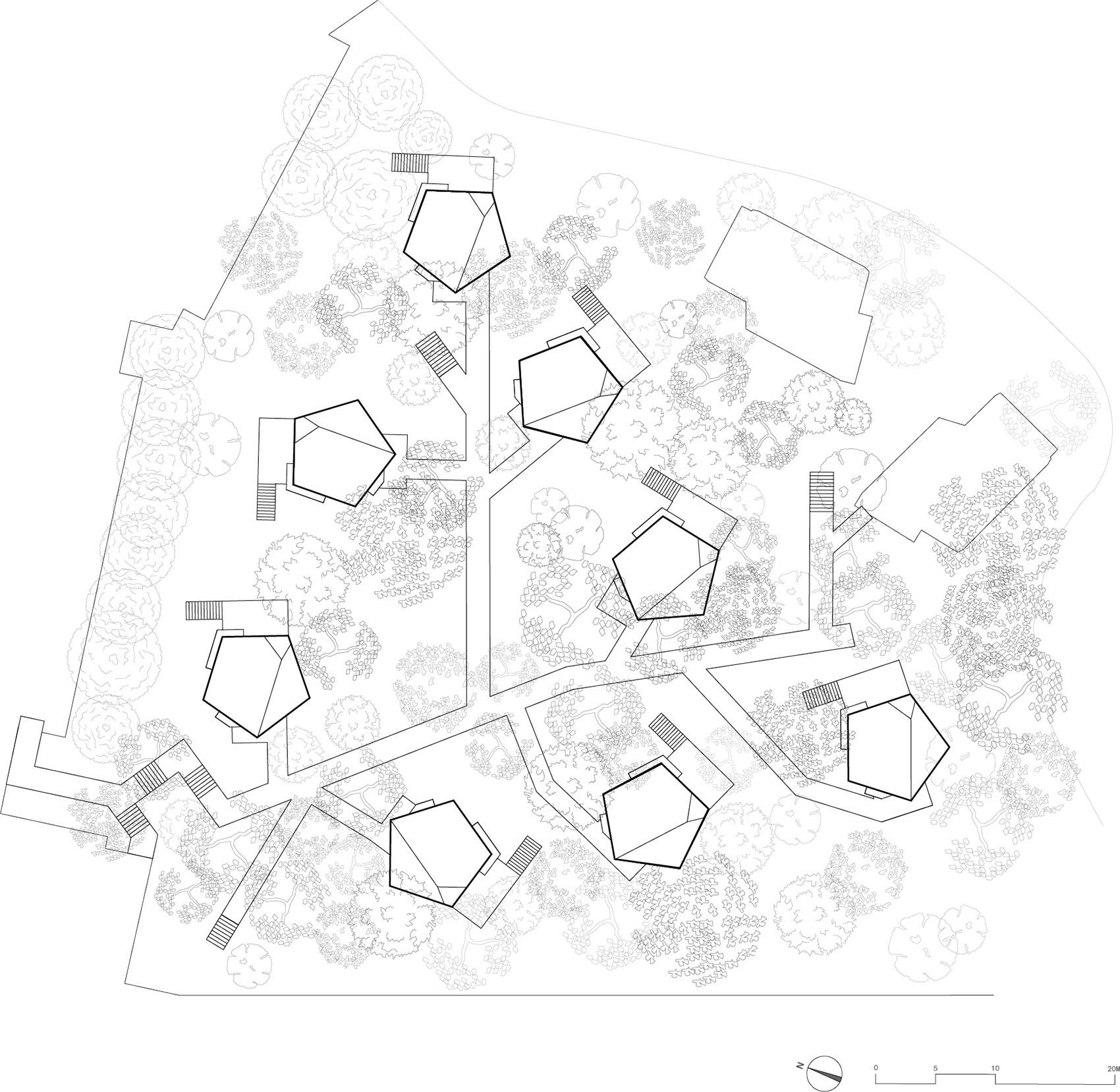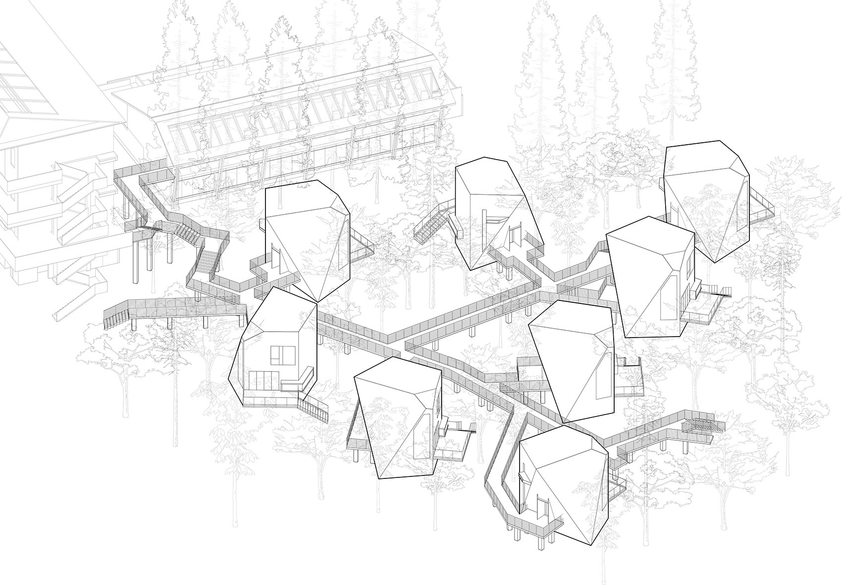▼林间的潜行之屋组团,cluster of stealth cabins in the forest
