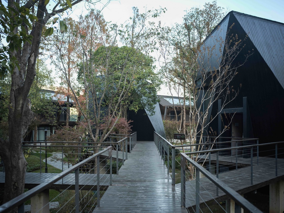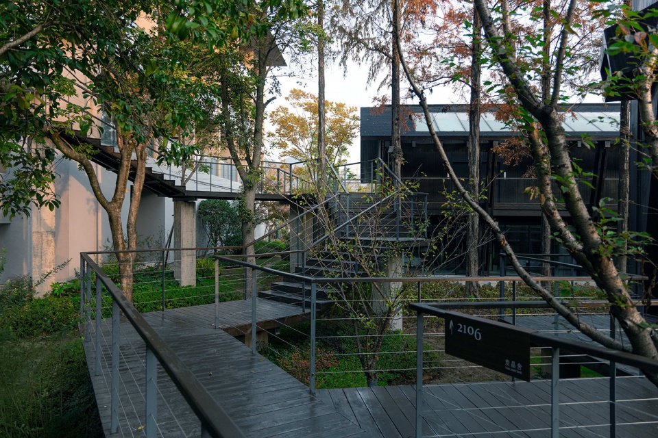 踩着掉落的枯枝败叶, 在架空走廊下穿行,草丛、苔藓在随地形起伏延续,这是属于这片场域的终极召唤。2022年开始,位于原杭州桐庐外婆家的这片山水迎来了自1990年以来最大规模的整体改造。中国变化最为激烈的20几年过去后,度假的内涵与形式外延都产生了极其巨大的变化,但经过对场地的认真探查,谱观建筑认为原初的场地策略尽管在具体形式,材质层面均已失效,但建筑与二十多年间共生的树木则凸显为一种有效的自然生长的场地策略。
