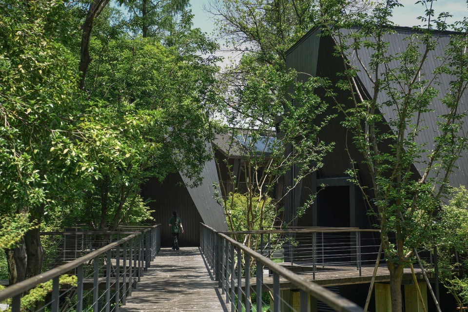 保留原建筑占位的极小占地,尽量保留了原生树林的完整,栈道架空保留自然系统的连贯和不被打扰,是为生态潜行。