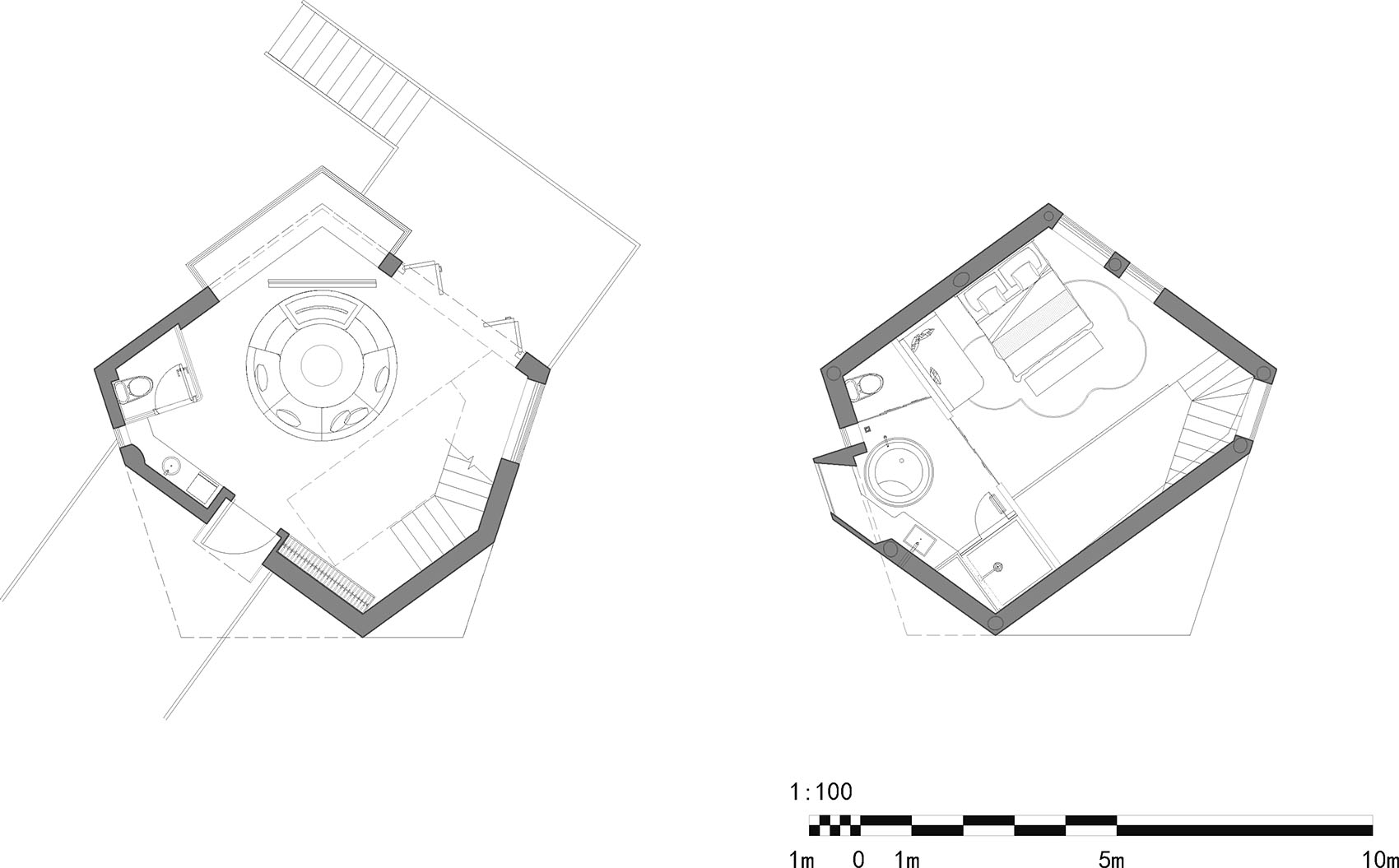 在这样的策略之下,新的黑色度假屋原位替换了泰式木楼,设计希望挑战的一点:建筑中的连续统一必须?能否以最简单的形式操作创造出一种形式,在同一个形体上造成多种表情。三角形过于简单,同样边长围合空间最小,四边形关于轴线和中心双重对称,过于板正,缺乏发展潜力。五边形是除这两者外最简单的形体,且具有一个中心对称轴和一个种轴对称方式,接下来就在这个形体上进行切削,地面、天空各自去除一角造成一种类似刚布兹体的在不稳定和稳定间切换的几何形体,让静止的形体具有了动态倾向。