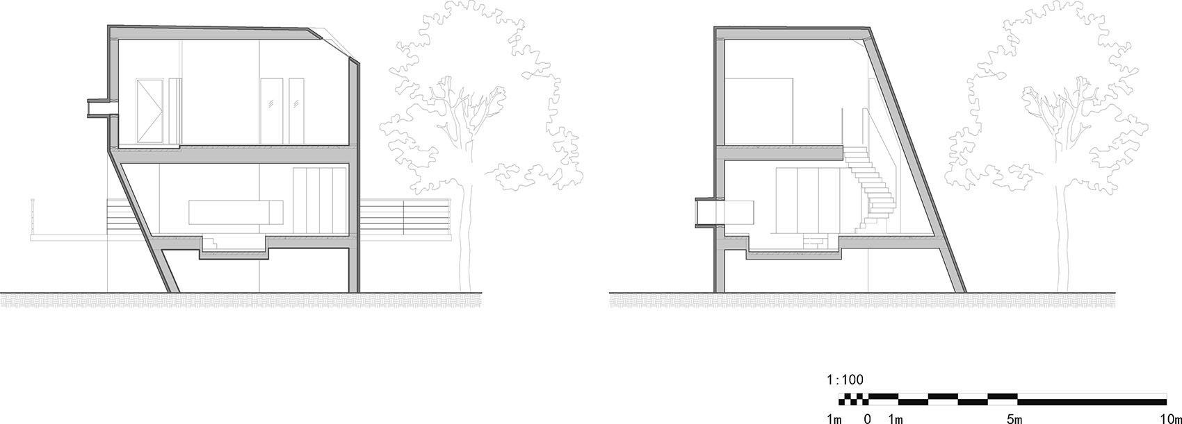 在项目设计的2022年,保护原生树木,有限建筑,进而追求建筑与自然的更有趣味的关系在刚刚结束地产狂潮的时期还是一个鲜少被采用的路径,我们欣喜地看到,从设计到建成的这些年,这慢慢成为一批建筑师的普遍自觉和人们可以越来越接受并欢迎的策略。