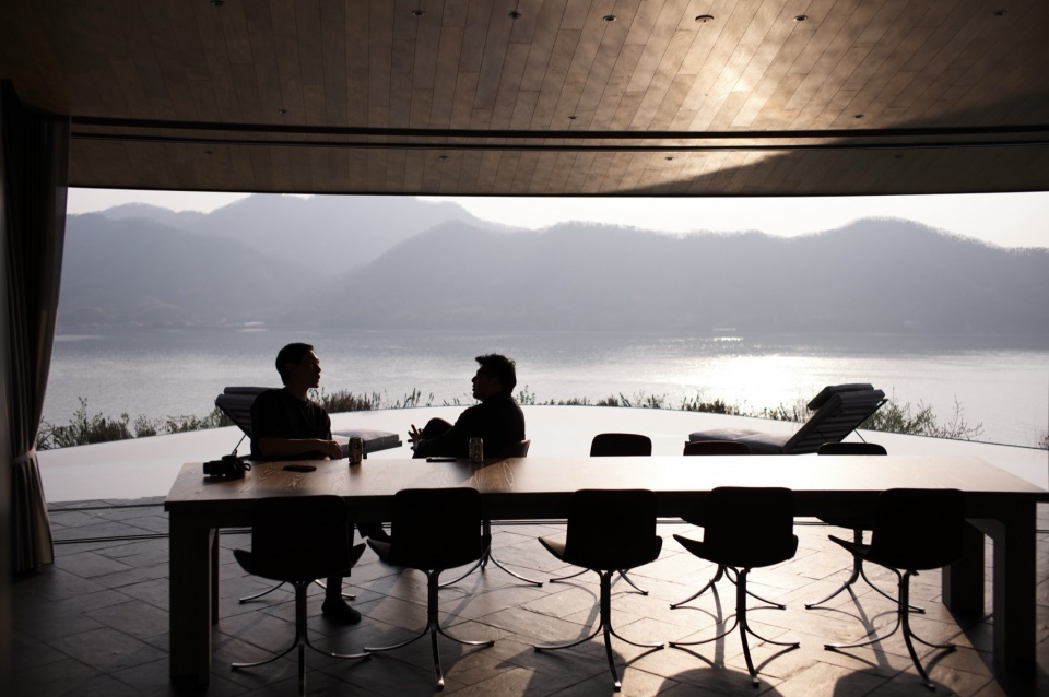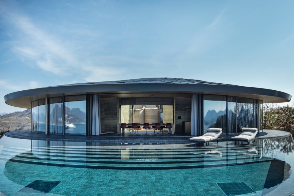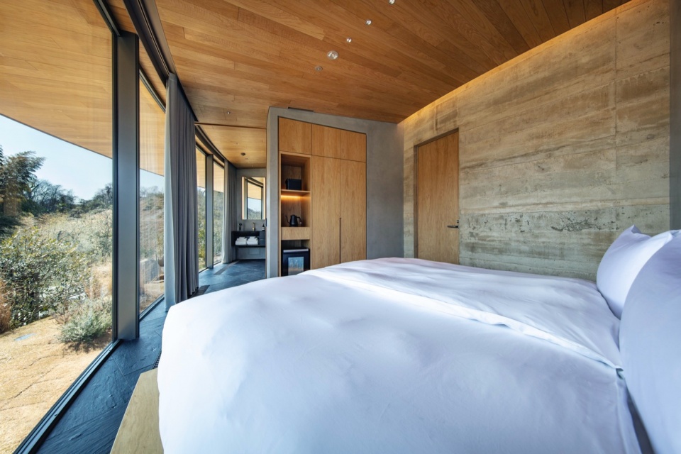 As a nod to Japanese vernacular design, the villas incorporate local materials and honour traditional Japanese architectural elements. The glass facades that dissolve the boundary between inside and out reinterpret shoji screens, while the pattern of the black slate floors takes cues from the layout of Japanese tatami mats. Incorporating soil directly from the site, the load-bearing clay walls are made using the traditional rammed earth technique, revealing colours and textures like geological strata.