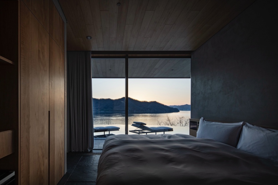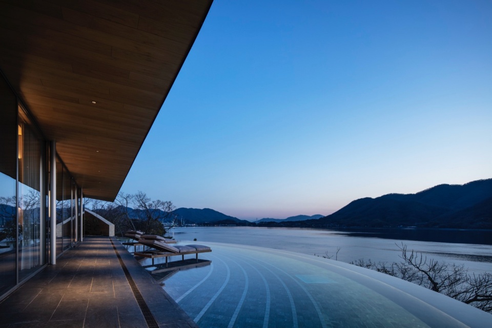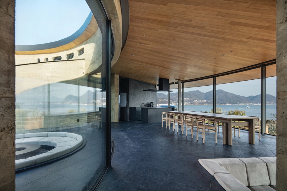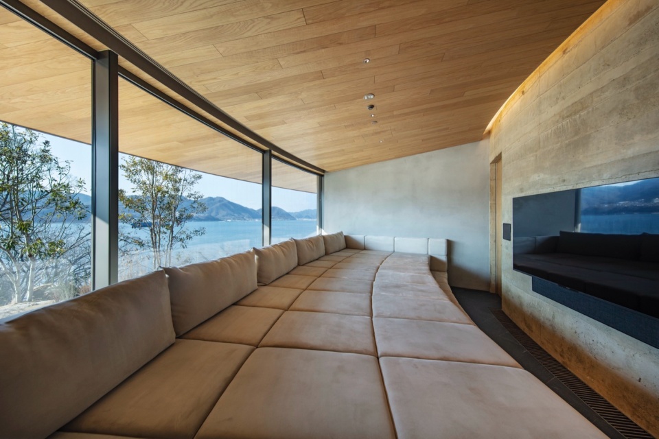 Each villa has been designed to reflect and respond to its unique position on the property. Sitting at the highest point of the site, the ring-shaped ‘360’ offers unobstructed views across Setouchi’s layered land and seascape in every direction, with a private courtyard in the middle. ‘270’ frames an expansive 270-degree panorama of the surrounding archipelago, featuring a sauna and outdoor relaxation areas arranged like floating islands around a pool alongside a firepit. At the peninsula’s tip, closest to the water’s edge, ‘180’ takes its shape from the coastline itself, with a curved form that echoes the shore. An inner courtyard unfolds with gentle slopes, mossy pathways, and trees that change colour with the seasons.