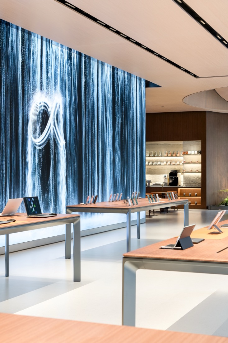 “传统科技空间往往冰冷、缺乏生命力,我们希望通过自然元素的融入,打破这种刻板印象。”荣耀HONOR Retail Design Studio 介绍道,结合门店所在的深圳湾,“山海连城,科技之湾”成为了项目的核心概念。