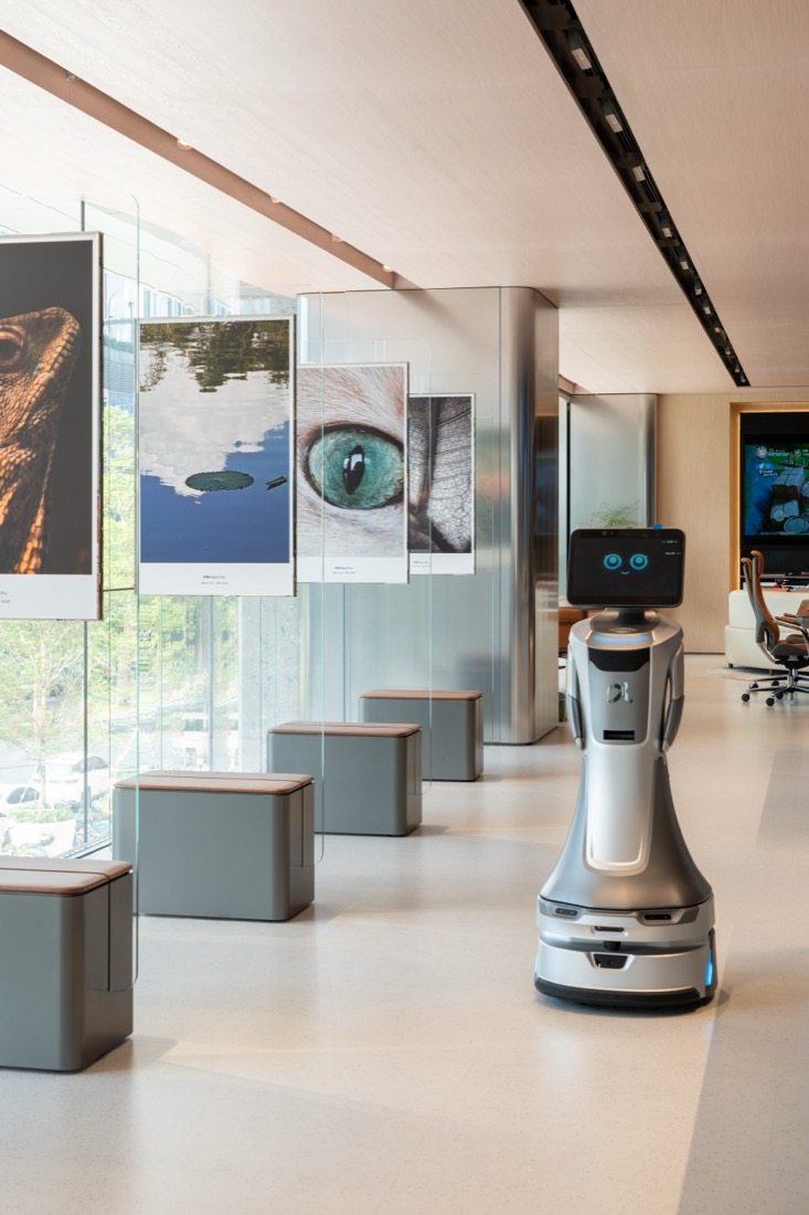 首层空间的核心是这块约 45㎡ 的沉浸式大屏,结合流水意象与阿尔法品牌LOGO,在昭示品牌形象的同时,扩展了空间的延伸感,以灵动动态的自然元素呼应设计的初衷。