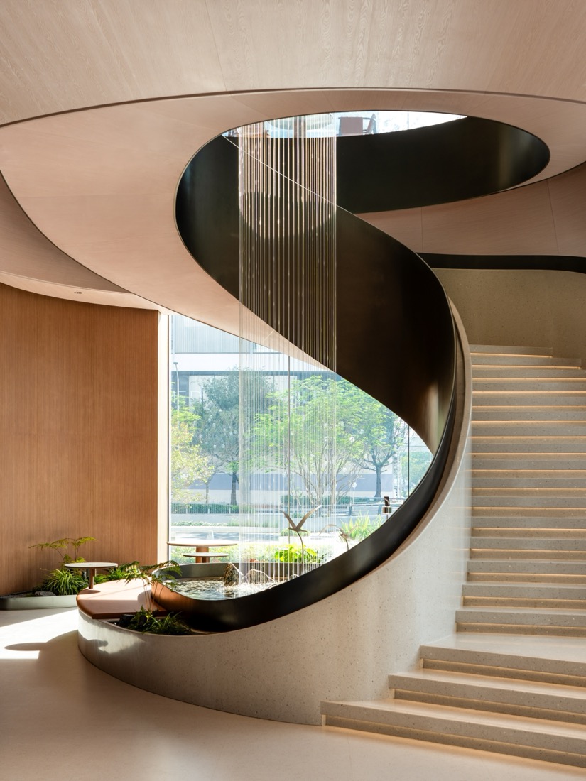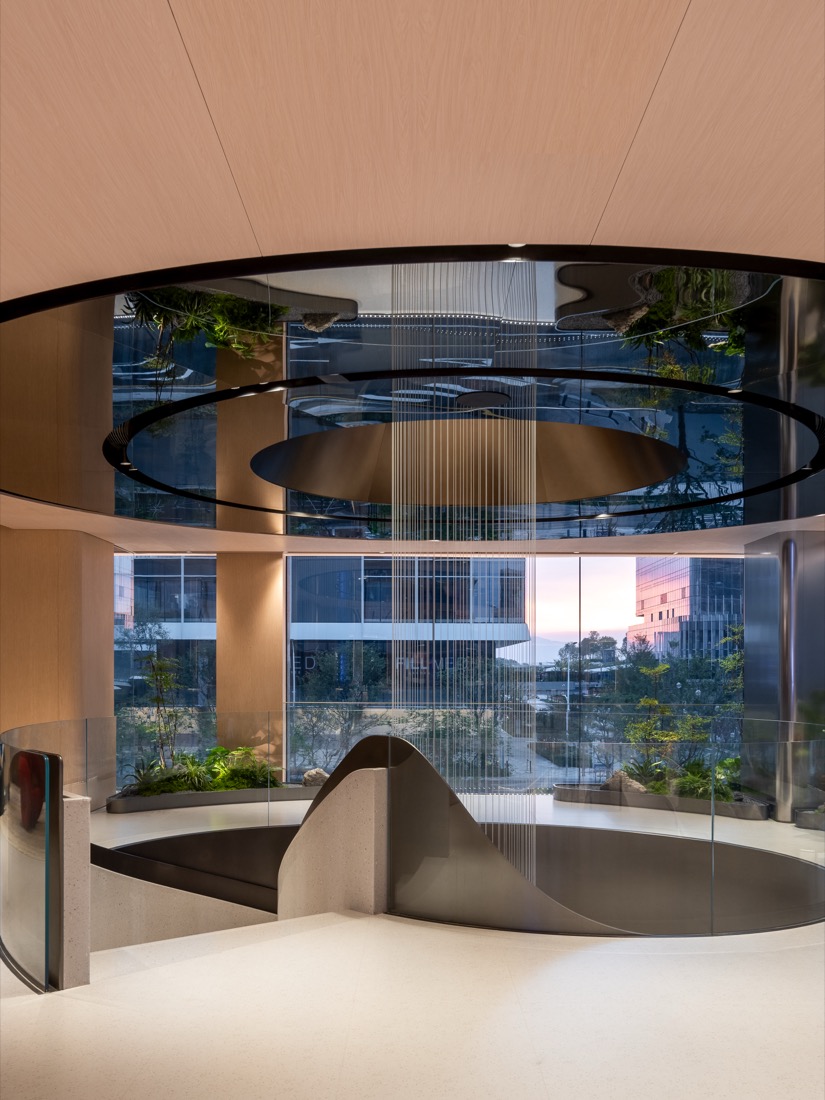 A sculptural spiral staircase wraps around a cascading water installation, transforming the vertical journey into an encounter with water’s momentum and resilience. At its base, a miniature landscape offers an artistic reinterpretation of Shenzhen Bay’s mangrove ecosystem.