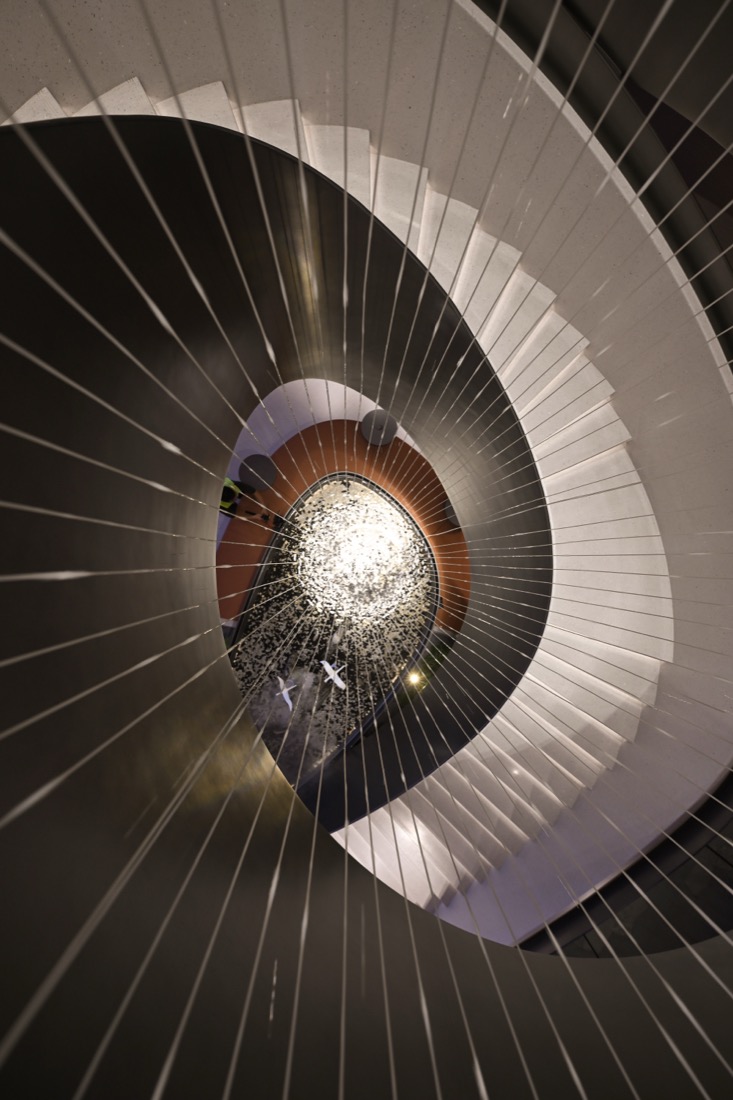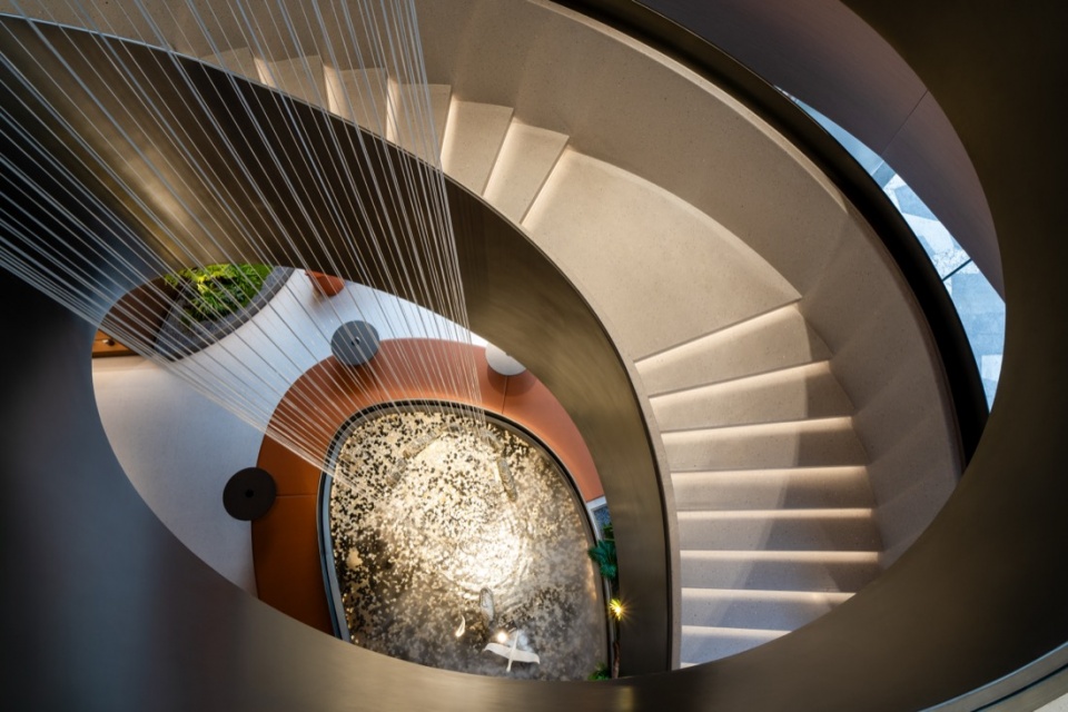 随着展示区域的丰富性,垂直动线的引导则至关重要。设计方希望将水的另一形态引入“速度,流畅以及更有力量”。