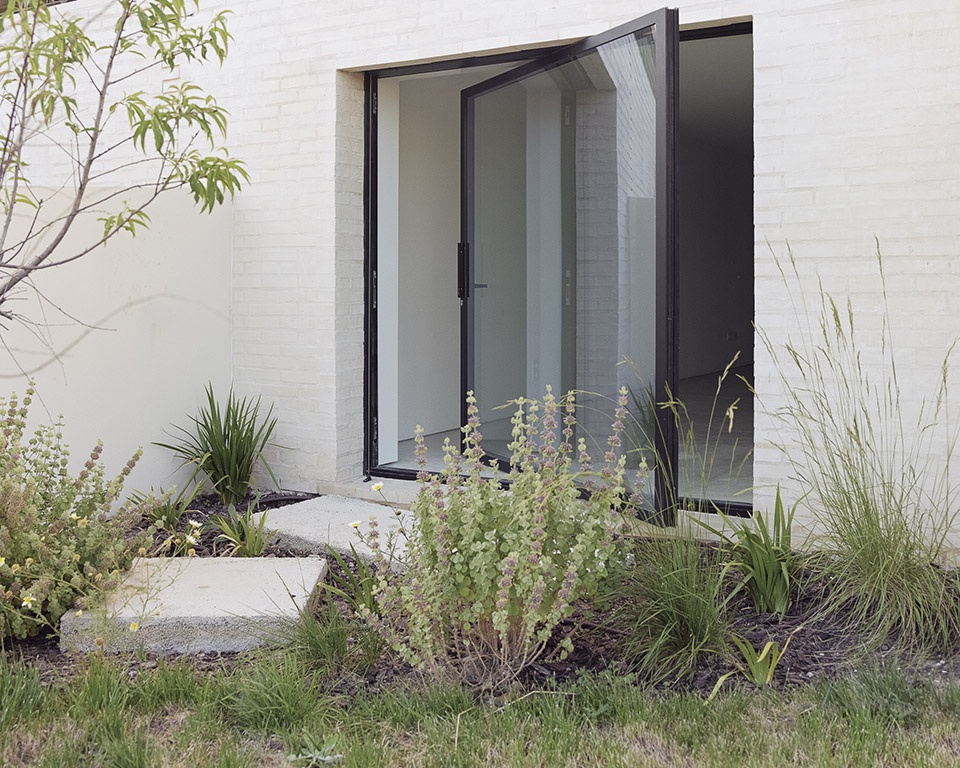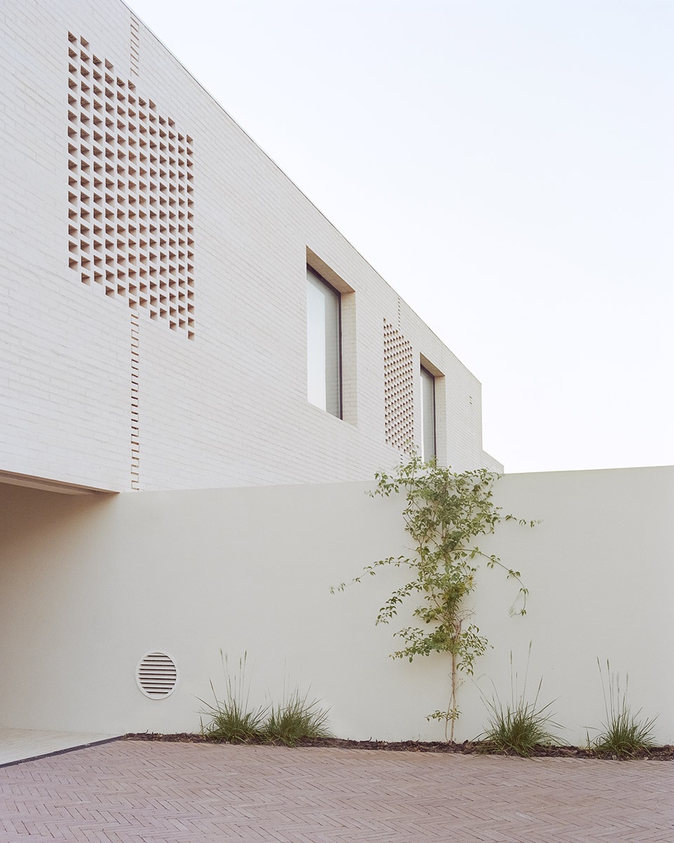 We researched industrial and low-maintenance elements that could be reimagined, such as white brick, which provided consistency across shading devices, ventilation systems, windows, stairs, exterior paving, and cladding. Exposed brickwork is not a common façade element in southern Portugal, where rendered or whitewashed surfaces dominate. Introducing this material, so archetypal in townhouse projects elsewhere, we aimed to bring a locally uncommon, yet timeless, expression to the project.
