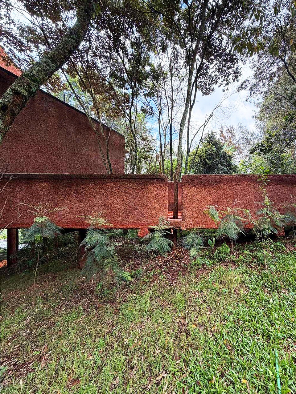 the structure lightly touches the sloping terrain raised on concrete piles