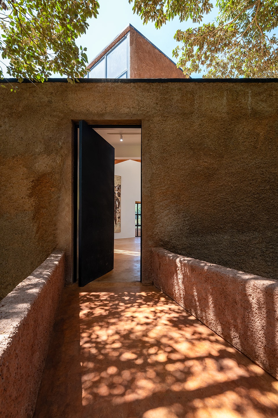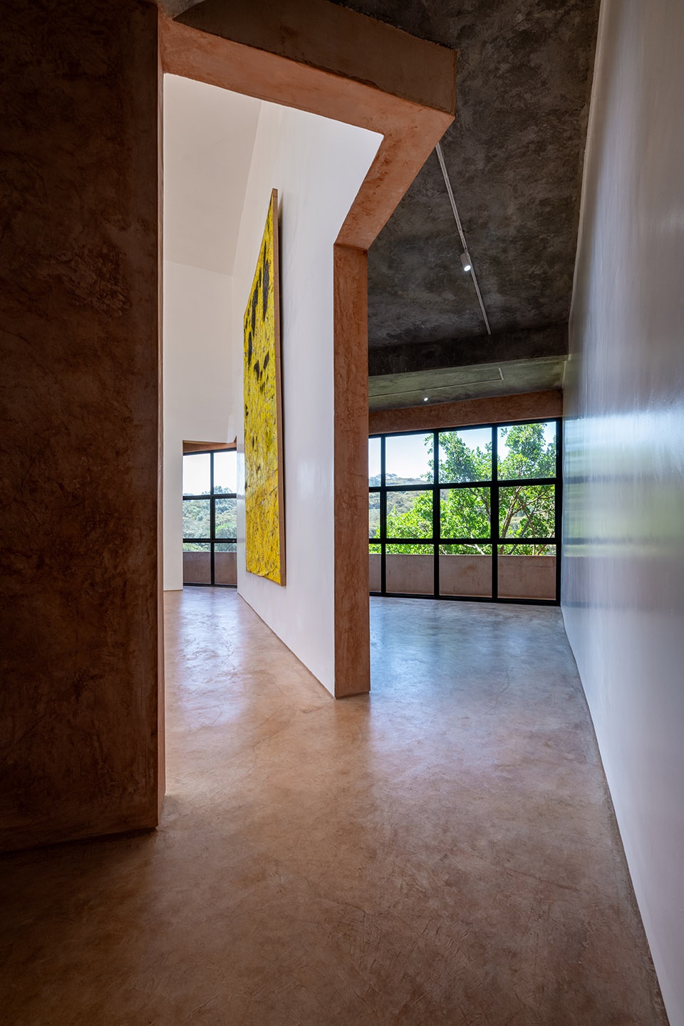 建筑核心为一处双层通高的工作室空间,宽敞明亮,适用于大型艺术创作。经打磨的低碳混凝土与土质地面实现了室内外空间的连续性。通过对自然光的控制与灵活的流线组织,该空间可同时作为创作、展示与存档之所。内嵌式储存系统支持多样的工作方式,包括用于纸本作品的平抽式储藏,以及用于大型悬挂作品的滑动式架体。