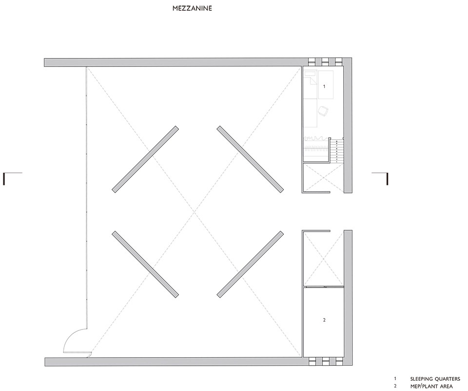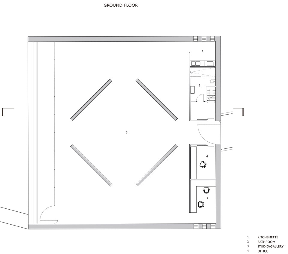 Above, a compact sleeping loft introduces a modest residential element while maintaining the primacy of the studio as the building’s central purpose. Environmental performance is addressed through a combination of passive and active strategies.