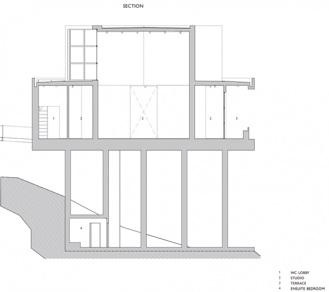 the structure lightly touches the sloping terrain