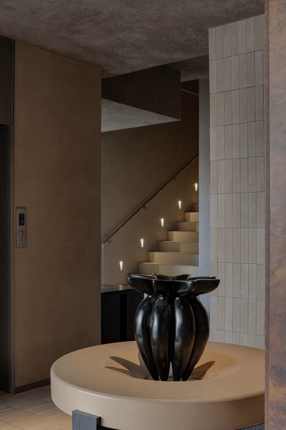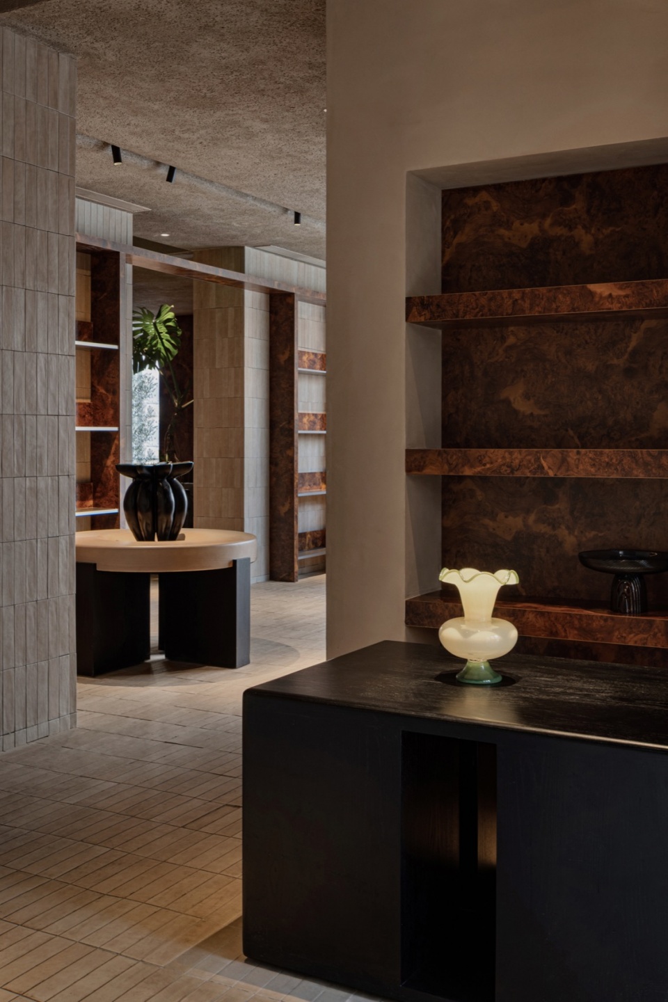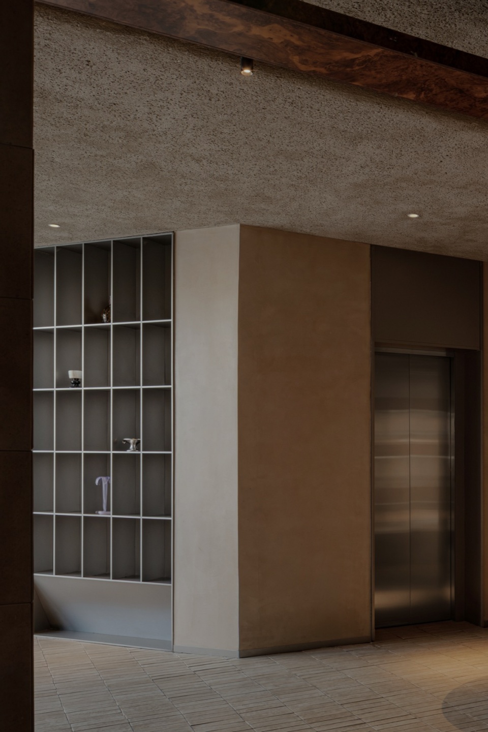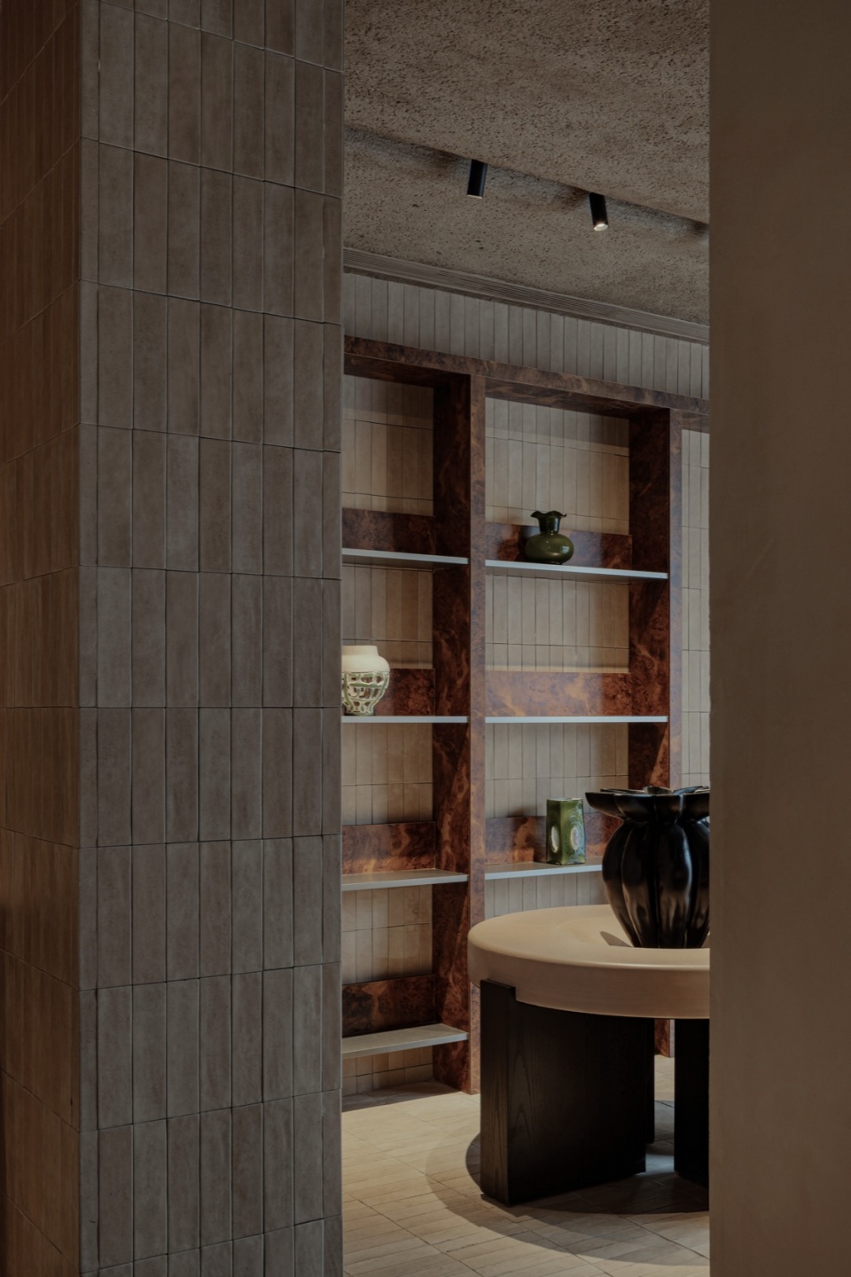 在组织空间色彩和材质的过程中,我们尝试在色彩和材质上都能融合一部分的情绪化的特质。为此,在大面积低饱和度的材质的基础上,我们让局部的色彩提亮,以打破空间稍显沉静的体验。围绕这个出发点,色彩的对比,空间材料的质感对比始终贯穿在一至三层的空间当中,希望在温和的气氛里,也能有一点点的出其不意。
