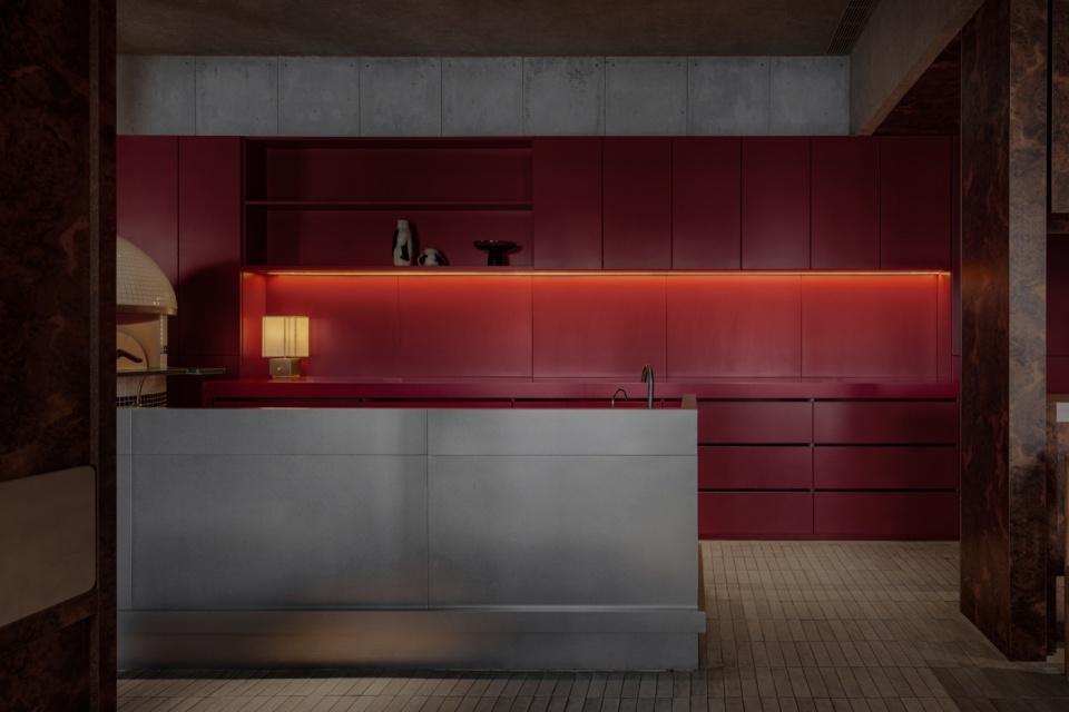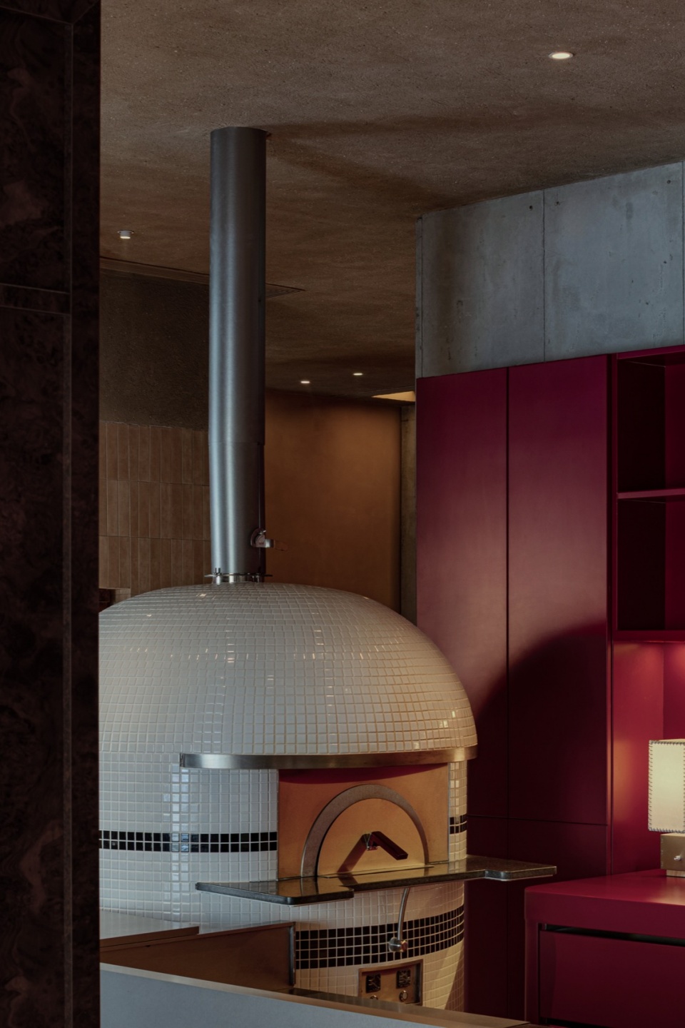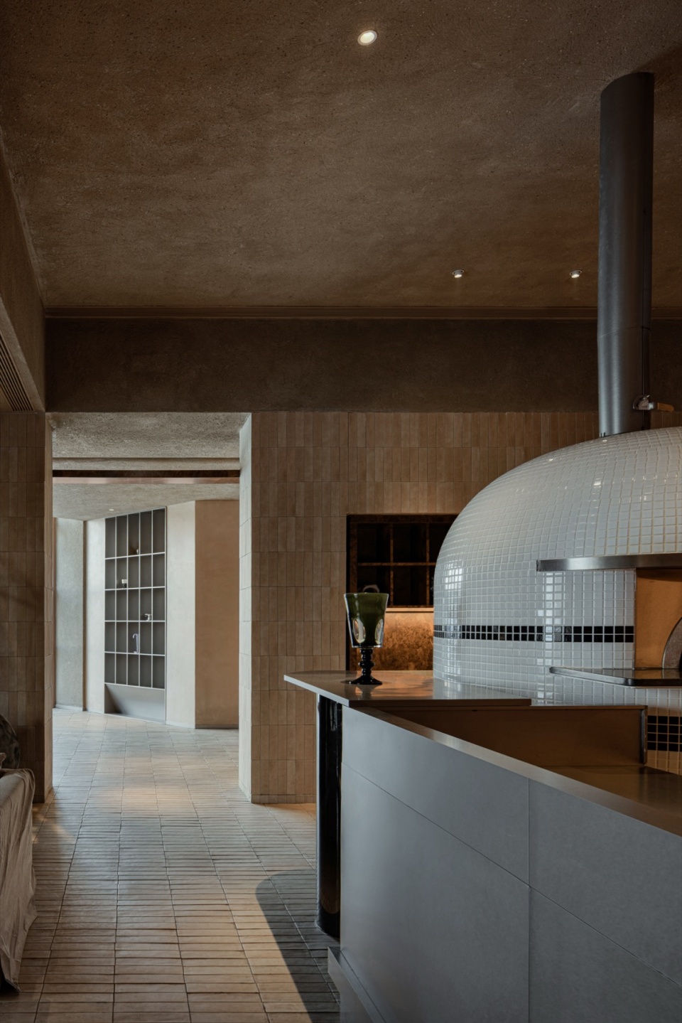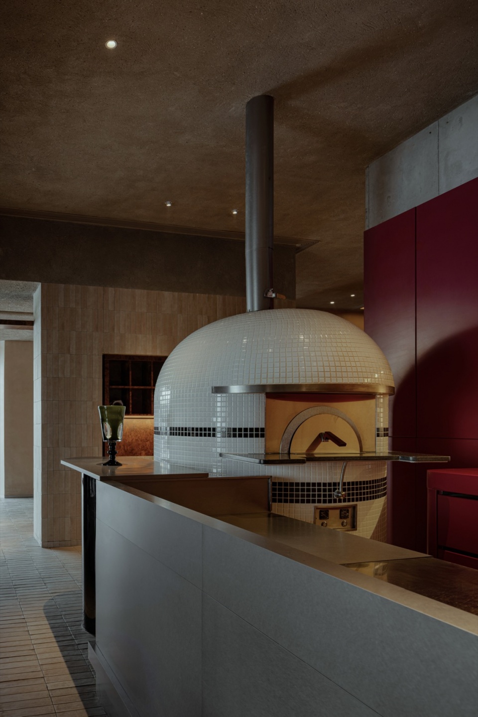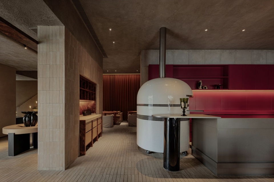 We emphasize a handcrafted sensibility. In terms of functional layout, we placed the bar at the center of the first floor, concentrating the preparation of pizzas and beverages. As a visual and functional hub, it radiates outward to the dining area. The open, on-site sensory experience of food and beverage preparation creates interactivity with the dining area, and the resulting emotional engagement aligns with the handcrafted quality of the spatial materials.
