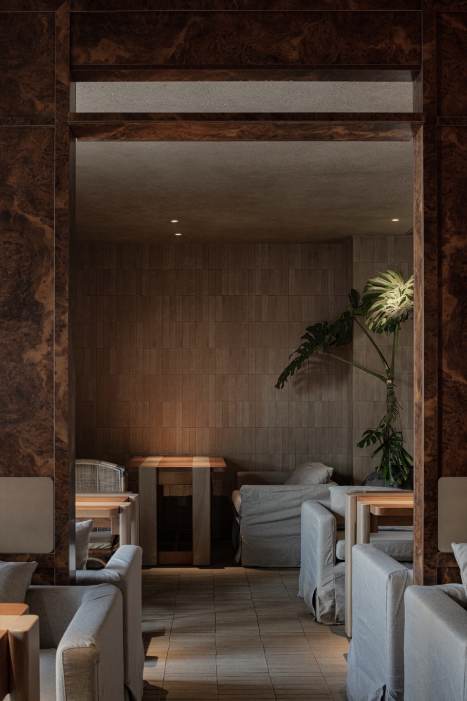 The restaurant is distributed across three floors. The first floor hosts the core functions of the public dining area. The design focuses on how to balance openness and privacy. On both sides of the entrance on the first floor, we have set up transitional zones with a “promenade” quality. Through the circulation, they naturally separate the external hustle and bustle from the dining area. This creates a second threshold leading to the dining space, enriching the experience of movement while effectively enhancing the privacy and comfort of the dining area.