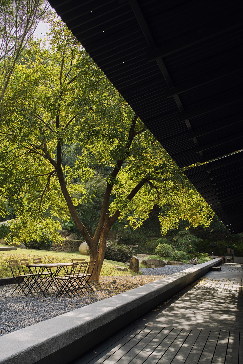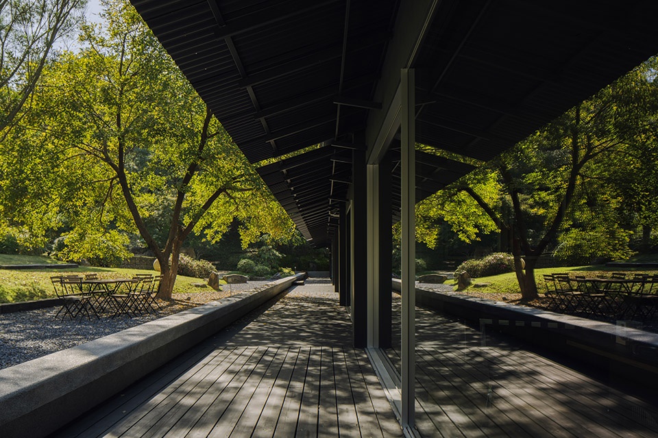 屋檐延续至室外,形成遮蔽与光影变化的边界,回应不同天气条件下的使用需求,在视觉上延伸建筑的体量感,同时引发情感上共鸣。