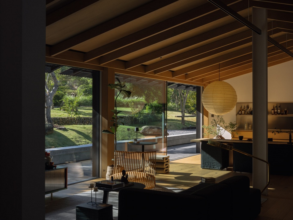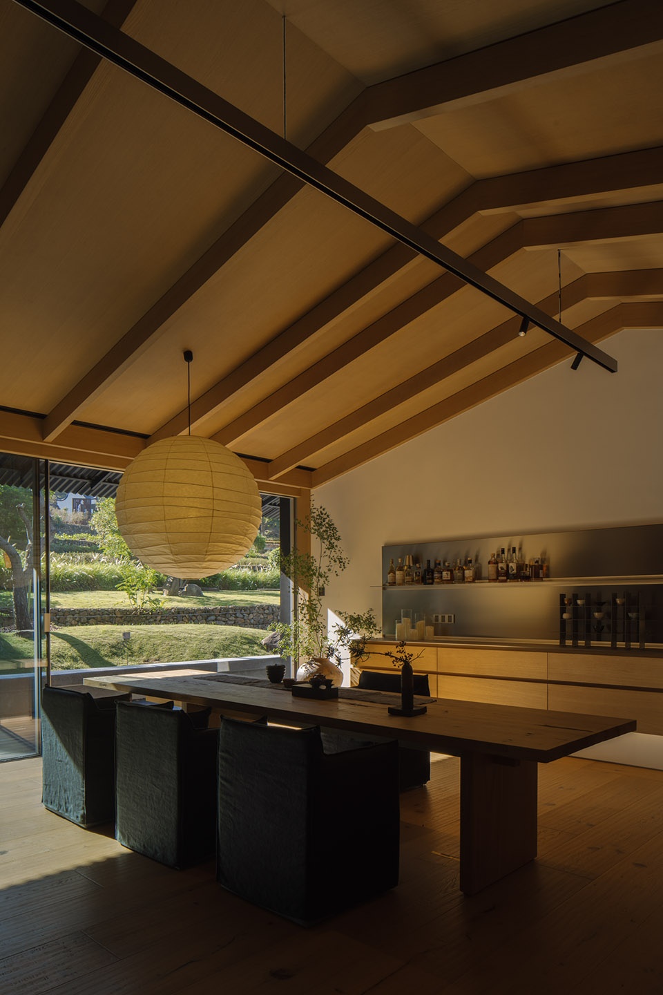 公共区域置于视野最佳位置,与自然景观直接对话;水吧台功能单元被整合于公区一侧,支持多种交流与使用场景。
