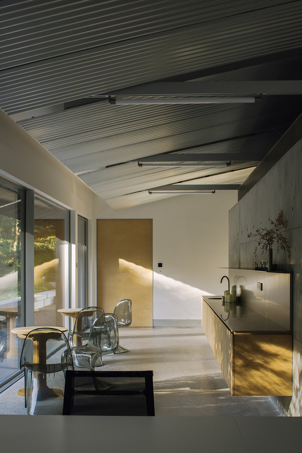 The communal area is placed where views are optimal, establishing direct dialogue with the natural landscape. The pantry unit is integrated along one side of the common area, supporting various activities and social scenarios.