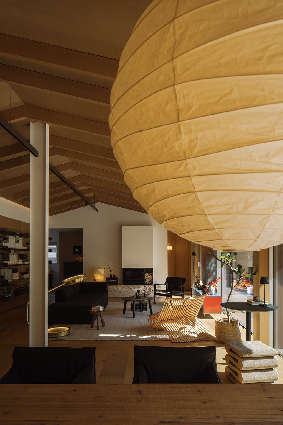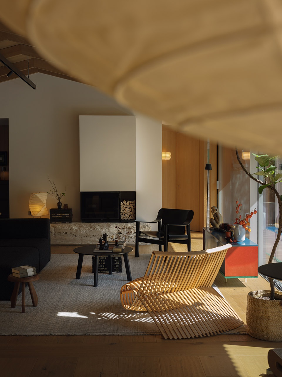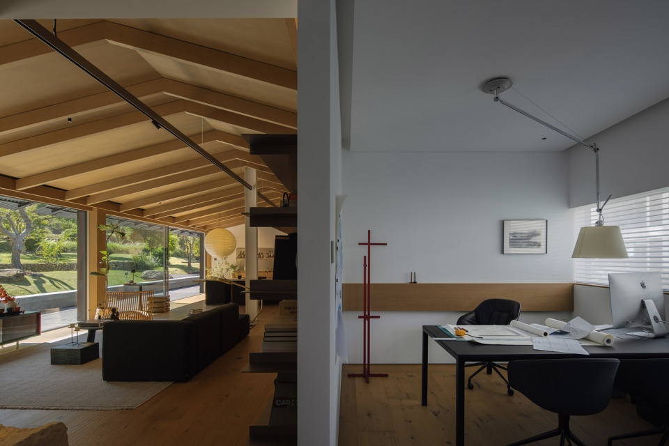 Rather than strictly segregating functions, the arrangement relies on the placement of spatial nodes and the treatment of interfaces, allowing work and daily activities to occur interchangeably within the same setting. This results in a flexible, multi-use condition.